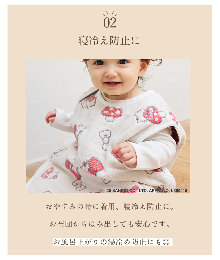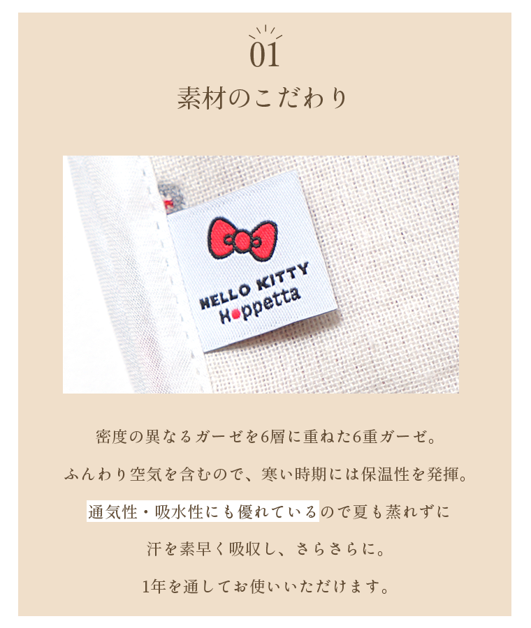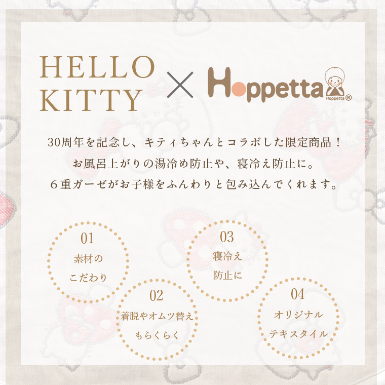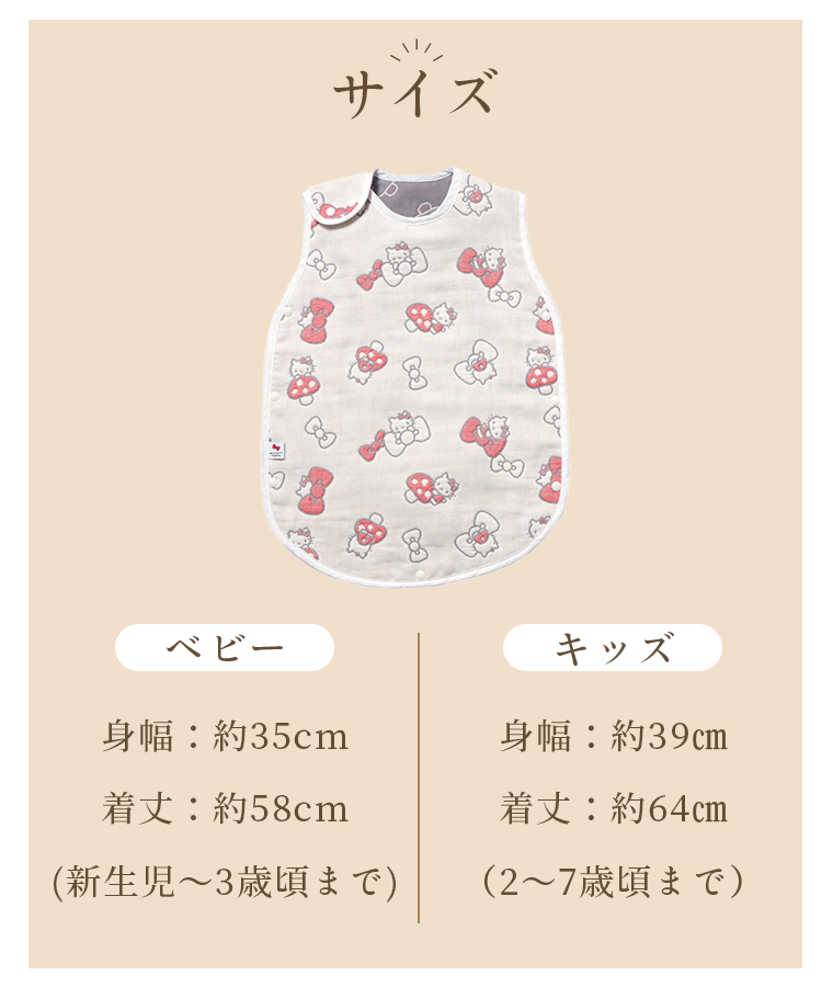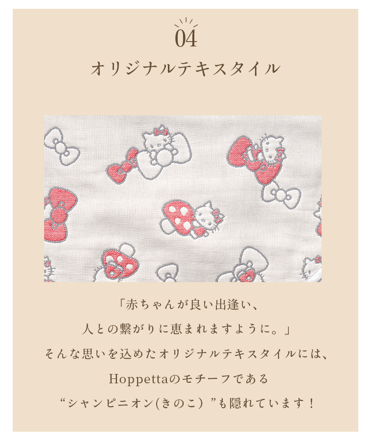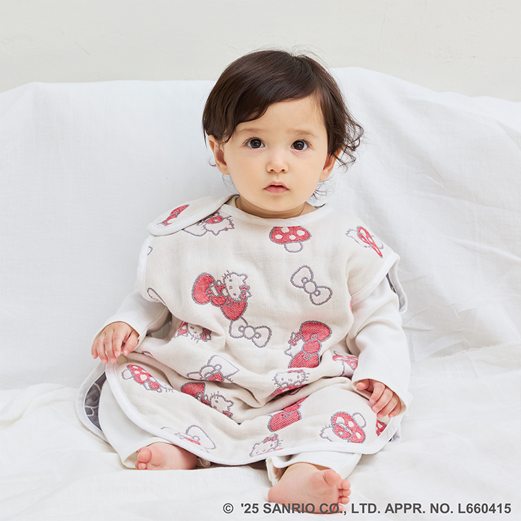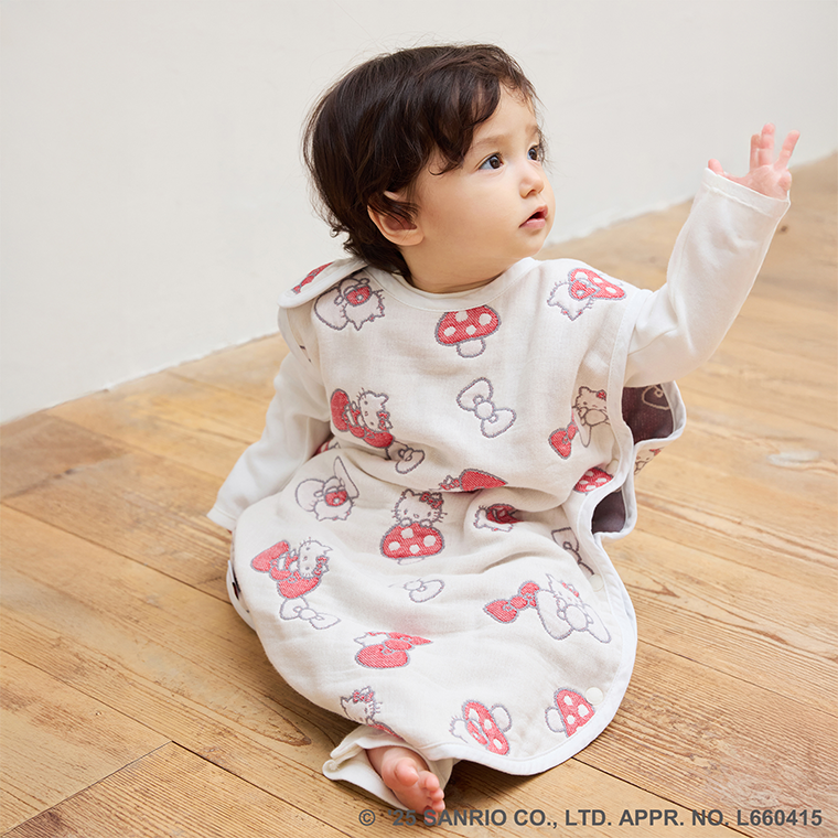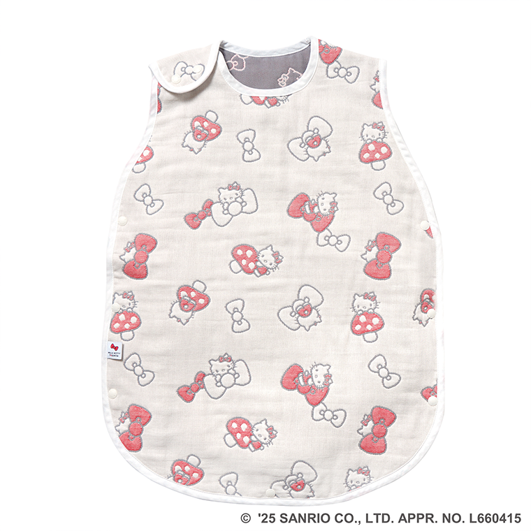■デザイン・気持ちと気持ちを結ぶ『なかよしのしるし』という思いが込められたハローキティのリボン。・「赤ちゃんが良い出逢い、人との繋がりに恵まれますように。」そんな思いを込めたオリジナルテキスタイルには、Hoppettaのモチーフである“シャンピニオン(きのこ)”も隠れています!・肩、両脇、股下にスナップボタンを採用。着脱やオムツ替えも楽々。■使用シーン・おやすみの時に着用、寝冷え防止に。お布団からはみ出しても安心です。・お風呂上がりの湯冷め防止に。・誕生日のギフトにもおすすめです。■素材・密度の異なるガーゼを6層に重ねた6重ガーゼ。ふんわり空気を含むので、寒い時期には保温性を発揮。通気性・吸水性にも優れているので夏も蒸れずに汗を素早く吸収し、さらさらに。1年を通してお使いいただけます。