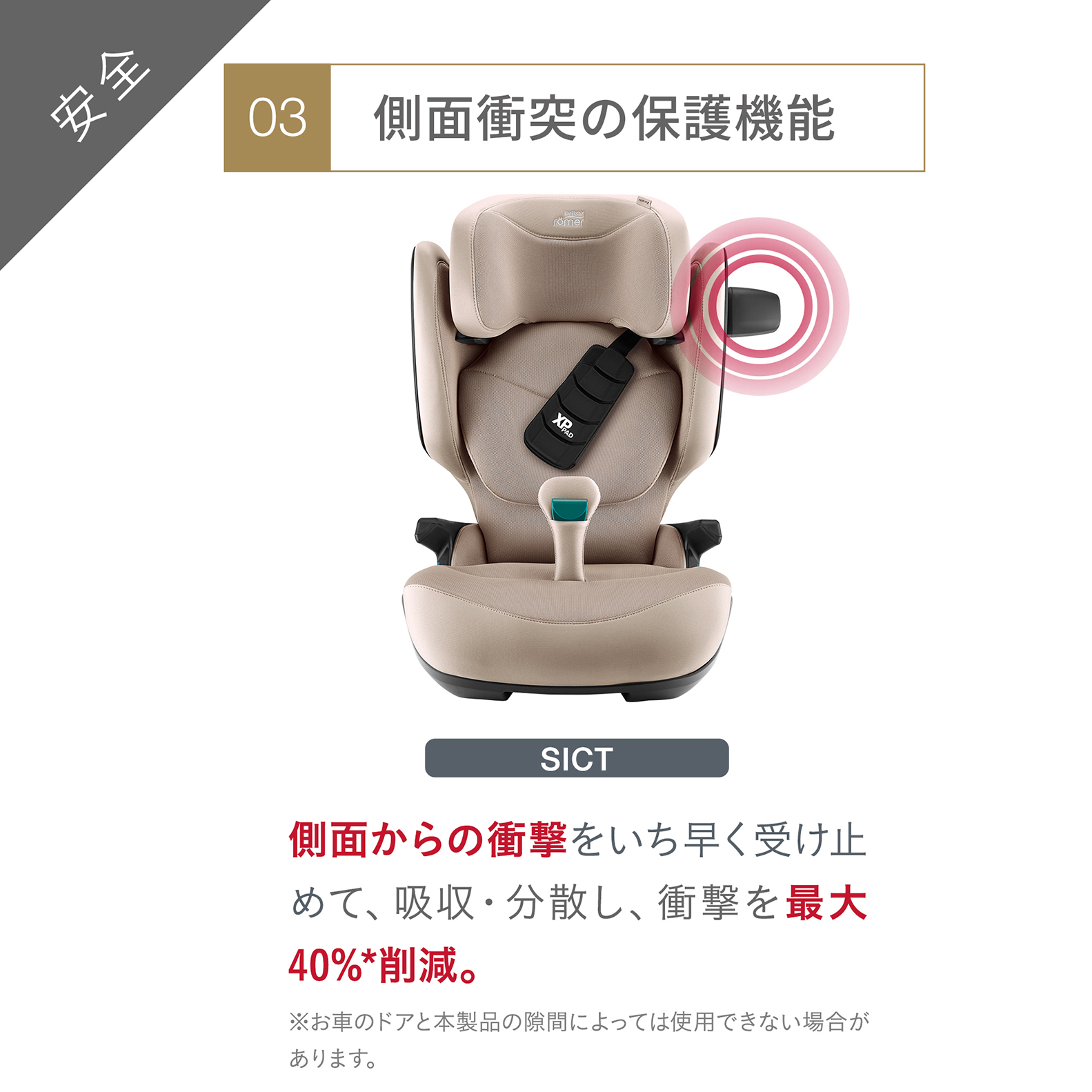 独自開発のXP-PAD・SICT・SecureGuardテクノロジーと、最適な衝突保護性能を実現するために再設計されたシートエリアの組み合わせによって、確かな安全性能を提供します。