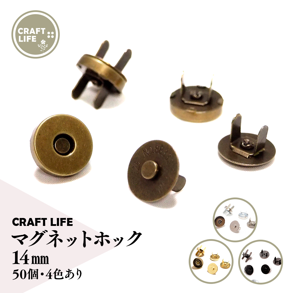 差し込み式の14mmマグネットホック・マグネットボタン50組セットです。縫い付け不要で取り付けが簡単。本体裏の突起を革や生地に差し込み、折り曲げるだけで作業完了。バッグやポーチの口止めに便利なマグネットホックです。針や糸が使えないもの・できれば縫いたくない場合にとても重宝する差し込み式となっております。マグネットは強力で、重い荷物を入れても大きなバックに使用しても安心です。