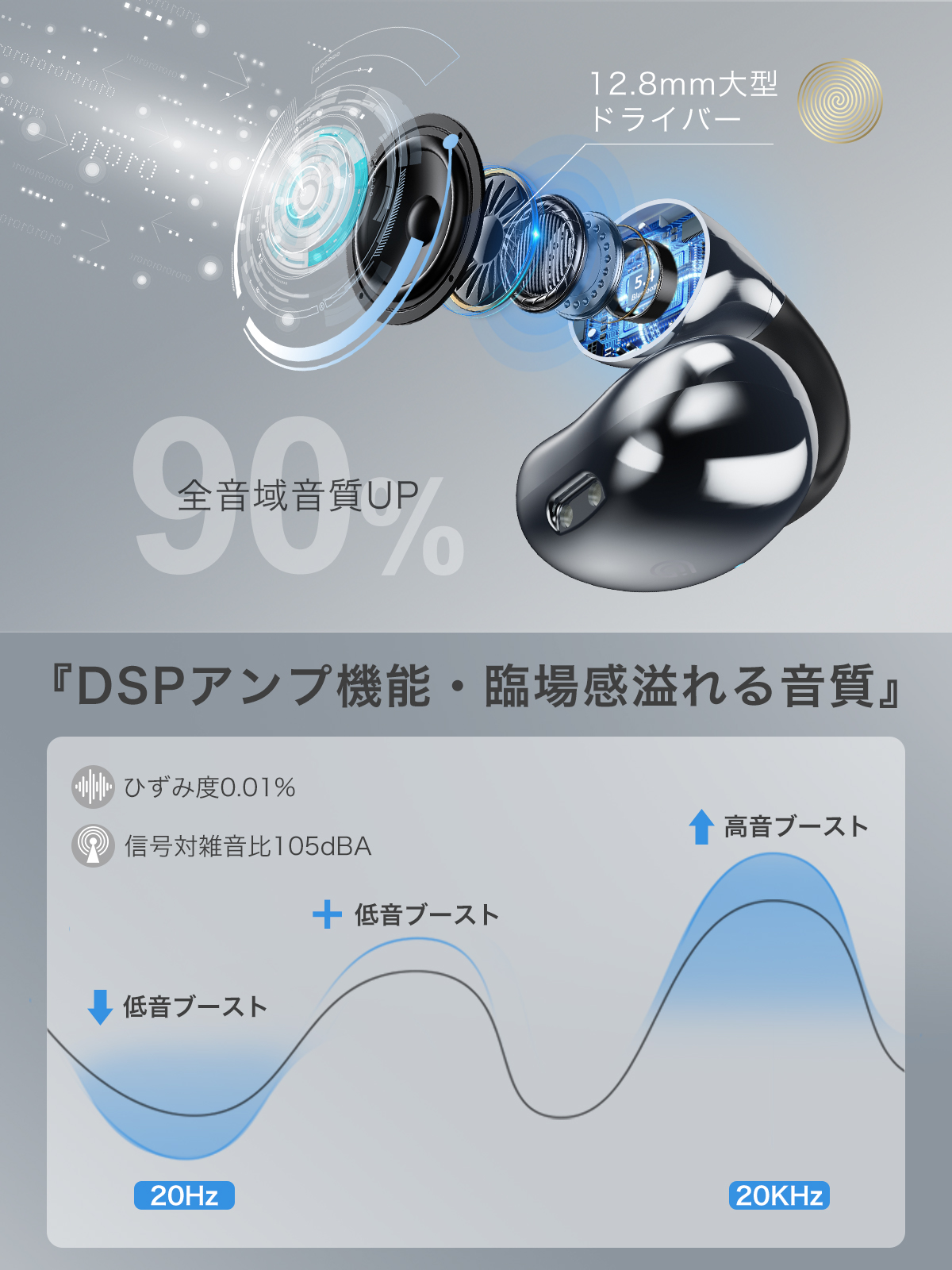 【Malleus AELCアルゴリズム技術・細部まで聴こえる音質】 「SoundClip」OWSイヤホンが採用したMalleus AELCアルゴリズム技術は、実際の入力音源と出力音圧の大小に応じて、高・低周波の出力レベルを自動的に調整することで、三つの周波数帯域における音量のバランスを最適化し、最高のリスニング体験を提供します。「SoundClip」OWSイヤホンは12.8mm超大型ドライバーを搭載し、クリアな高音から自然に響く低音まで、あらゆる音域で豊かな音色を楽しめます。まるでライブ会場で聴いているような圧倒的な存在感のあるオーディオ体験を生み出します。膜の張ったようなこもりを感じることなく、没入感のあるHi-Fiサウンドをそのまま楽しめます。