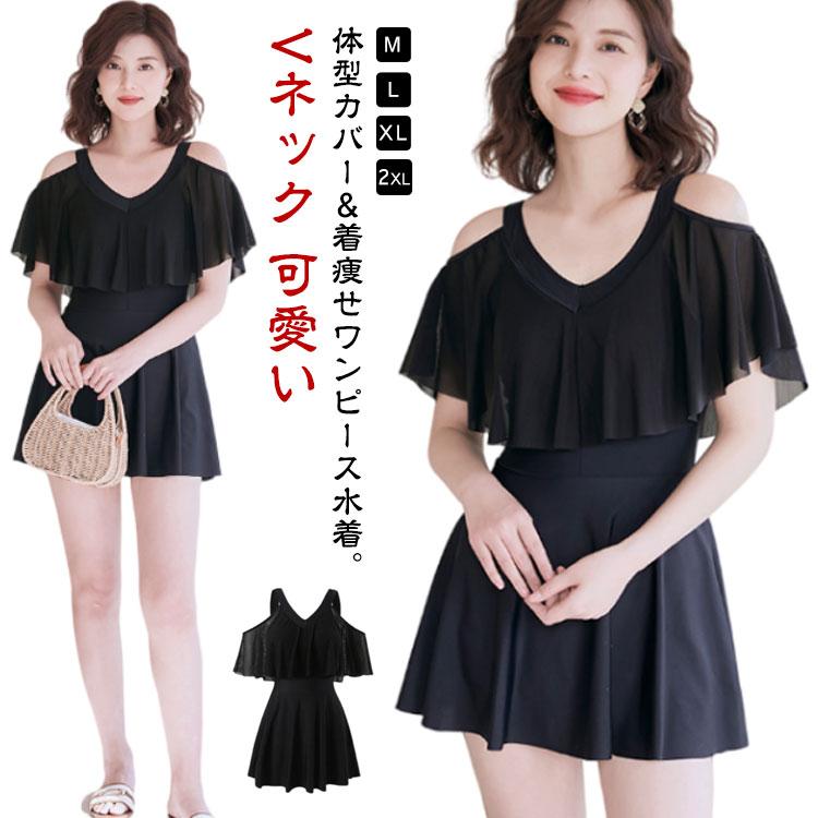水泳 体型カバー水着 レディース ブラック ママ水着 大きいサイズ オフショルダー フレア ワンピース 二の腕 カバー オトナ女子 スイム