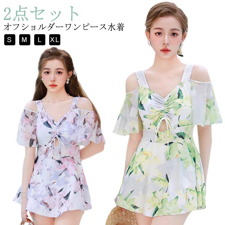 40代 水着 20代 オフショルダー フレア レディース 2点セット ショートパンツ 花柄 ワンピース ママ水着 露出控えめ ワンピース水着 30代