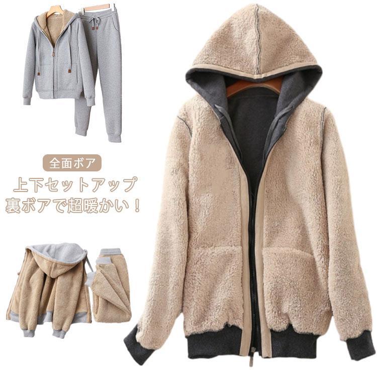 セットアップ レディース フード付き 裏起毛 パーカー 裏ボア スウェット ボア 長袖 トップス パンツ セットアップ 2点 上下セット 冬 厚手 パ