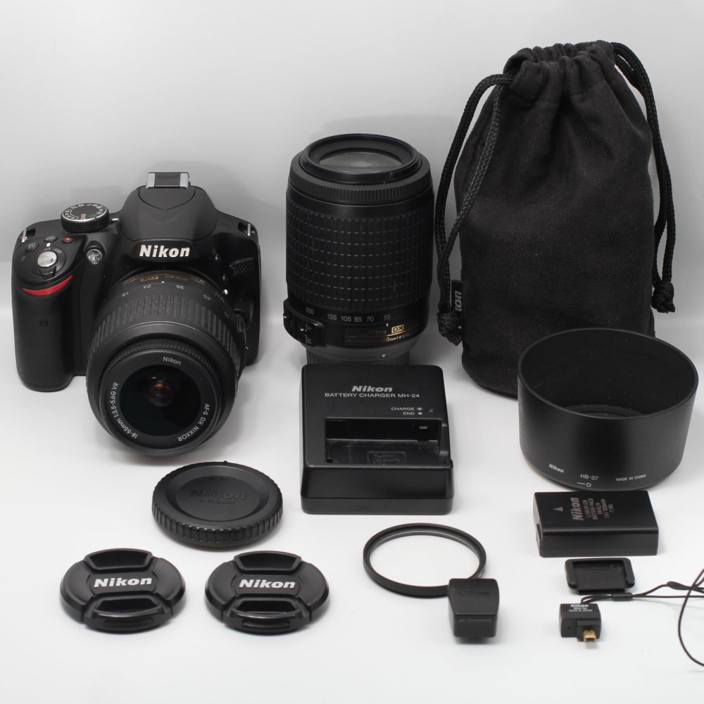| 商品の説明 (新品の場合) | 商品紹介 ブレを抑えてシャープに撮れる。ホールド感に優れた小型・軽量ボディー。 約2,400万画素(24.2メガピクセル)の高画素による高精細な描写と、人物の肌の質感や空のグラデーションなどを滑らかに再現する豊かな階調表現を実現しています。 夜景撮影、薄暗い室内での撮影、動き回る子どもやペットの撮影でも画質の低下を気にすることなく高感度を設定し、高速シャッタースピードでブレを抑えた撮影ができます。 上手な撮り方をカメラが教えてくれる。さらに使いやすくなった「ガイドモード」。 グリップ感、操作性にこだわったシンプル&スリムデザイン。 デジタル一眼レフカメラでの動画撮影がよりきれいに簡単にできるフルHD対応Dムービー。 撮影した画像をカメラだけで簡単に加工できる画像編集機能を搭載。 【AF-S DX NIKKOR 18-55mm f/3.5-5.6G VR】広角域から中望遠域までの画角範囲をカバーする約3.1倍の、解像力に優れた標準ズームレンズです。 【AF-S DX VR Zoom-Nikkor 55-200mm f/4-5.6G IF-ED】焦点距離200mmまでの画角範囲をカバーする小型・軽量の望遠ズームレンズ。 ご注意(免責)>必ずお読みください 商品は全体的に綺麗で非常に良い状態になります。 |