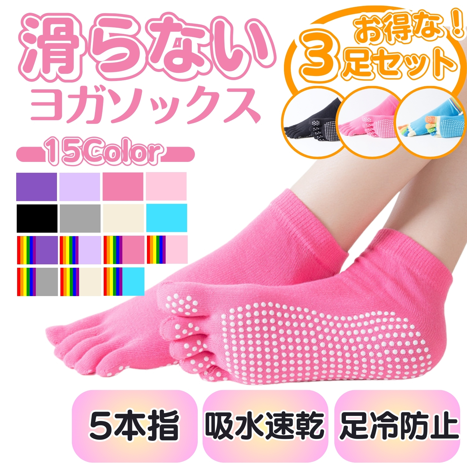ヨガソックス 3足セット 5本指 靴下 滑り止め レディース 指あり ランニング スポーツ ピラティス すべり止め 冷え予防 ジム