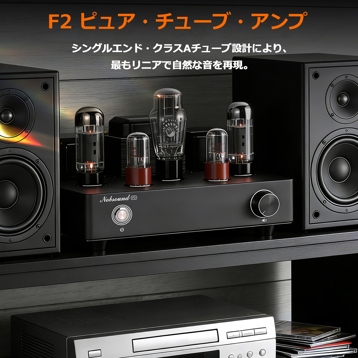 アナログの温もりと、音楽の生きた質感を求めるあなたへ。Nobsound F2は、シンプルかつ純粋なシングルエンドA級回路を採用した真空管プリメインアンプです。その回路構造から生まれるのは、豊かで滑らかなトーンと、自然な音の立体感。交換可能な整流管、プリアンプ管、パワー管によって、お好みの音色へと自分だけのチューニングを楽しめる「管球交換(チューブ・ローリング)」の魅力も存分に味わえます。厳選されたオーディオグレード部品と確かな変圧器が支える9W×2のA級パワーは、多くのブックシェルフスピーカーやフロアスタンディングスピーカーを優しくも確実に駆動し、没入感のある音楽体験を約束します。リビングルームの一角や書斎で、真空管の柔らかな灯りに包まれながら、音楽と向き合う特別な時間をお届けします。
