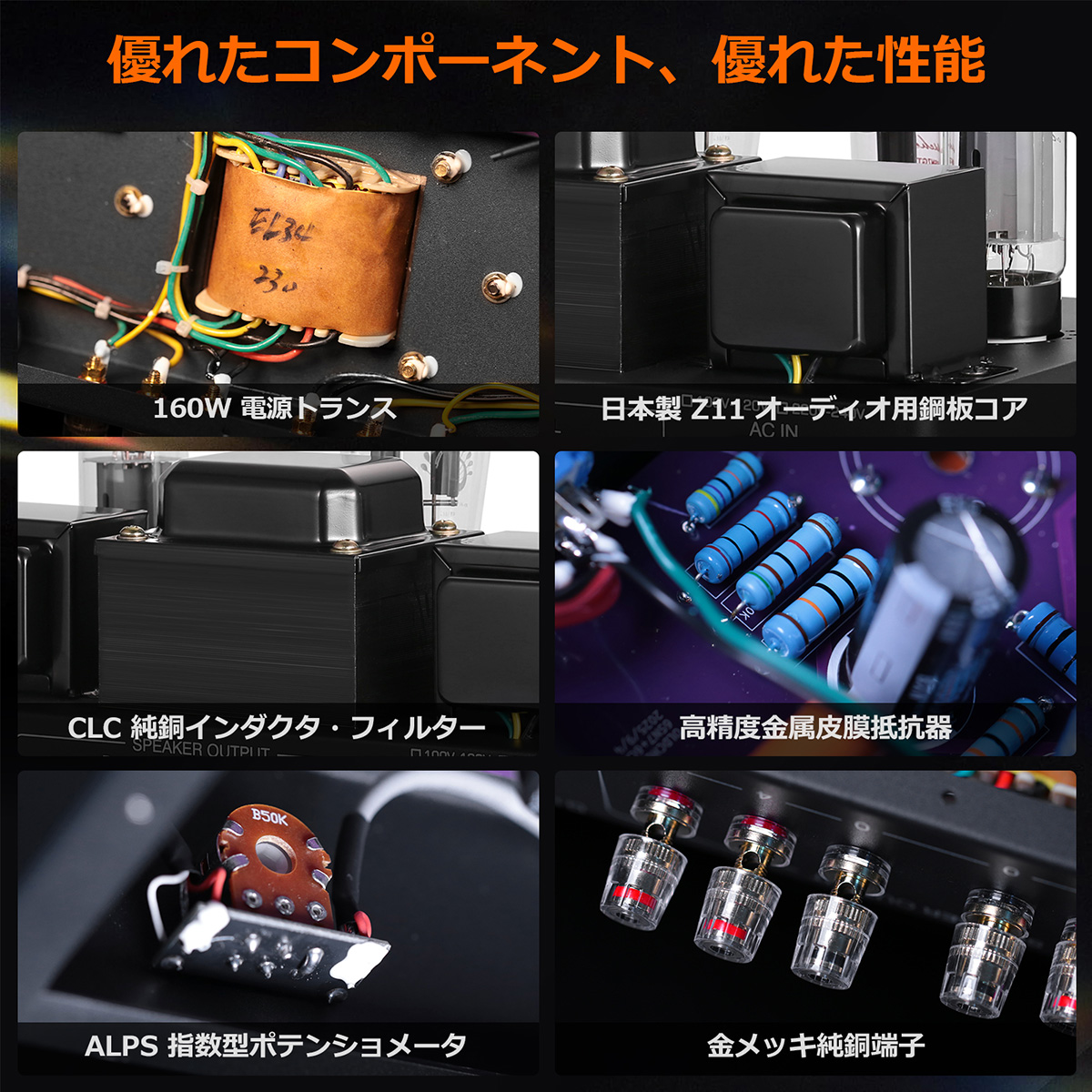温かい音色の背景には、確かな性能を支える高品質な内部部品への投資があります。電源の心臓部には、磁気漏れが少なく安定給電に貢献する日本製Z11鉄芯を採用した160Wトランスを搭載。信号の経路には経年変化に強いALPS社製の精密ポテンショメーターを採用し、音量調整時のチャンネルバランスの良さを確保。さらに、スピーカー端子には接続抵抗を低減する金メッキ処理を施しています。一つひとつの部品選定が、ノイズフロアを低く抑え、真空管が本来持つ美しい音色を余すところなく引き出す基盤となっています。