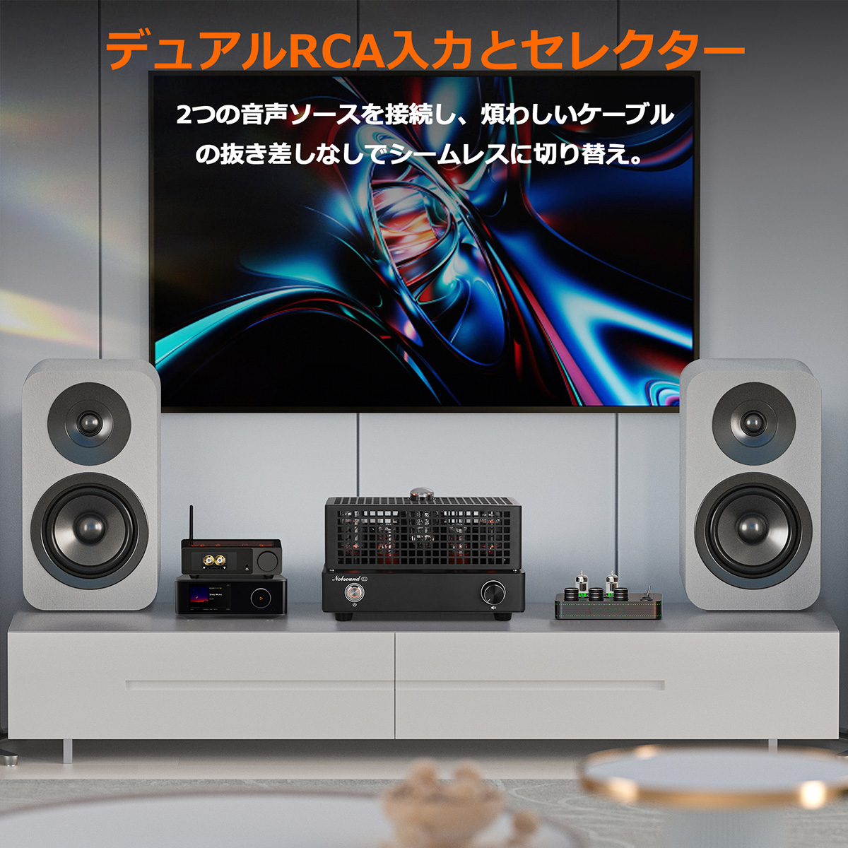 日常の音楽生活を快適にするための実用性にも配慮しています。2系統のRCA入力端子と前面の入力切替スイッチを備えており、例えばDAC(デジタルアナログコンバーター)とレコードプレーヤー用フォノイコライザーを同時に接続し、前面のスイッチ操作で瞬時に音源を切り替えることができます。これにより、音楽を聴く際の面倒なケーブルの抜き差しから解放され、より純粋に音楽を選び、楽しむことに集中できる環境を整えます。コンパクトながらも存在感のあるデザインは、どんな室内にも溶け込み、オーディオシステムの視覚的な中心としても機能します。