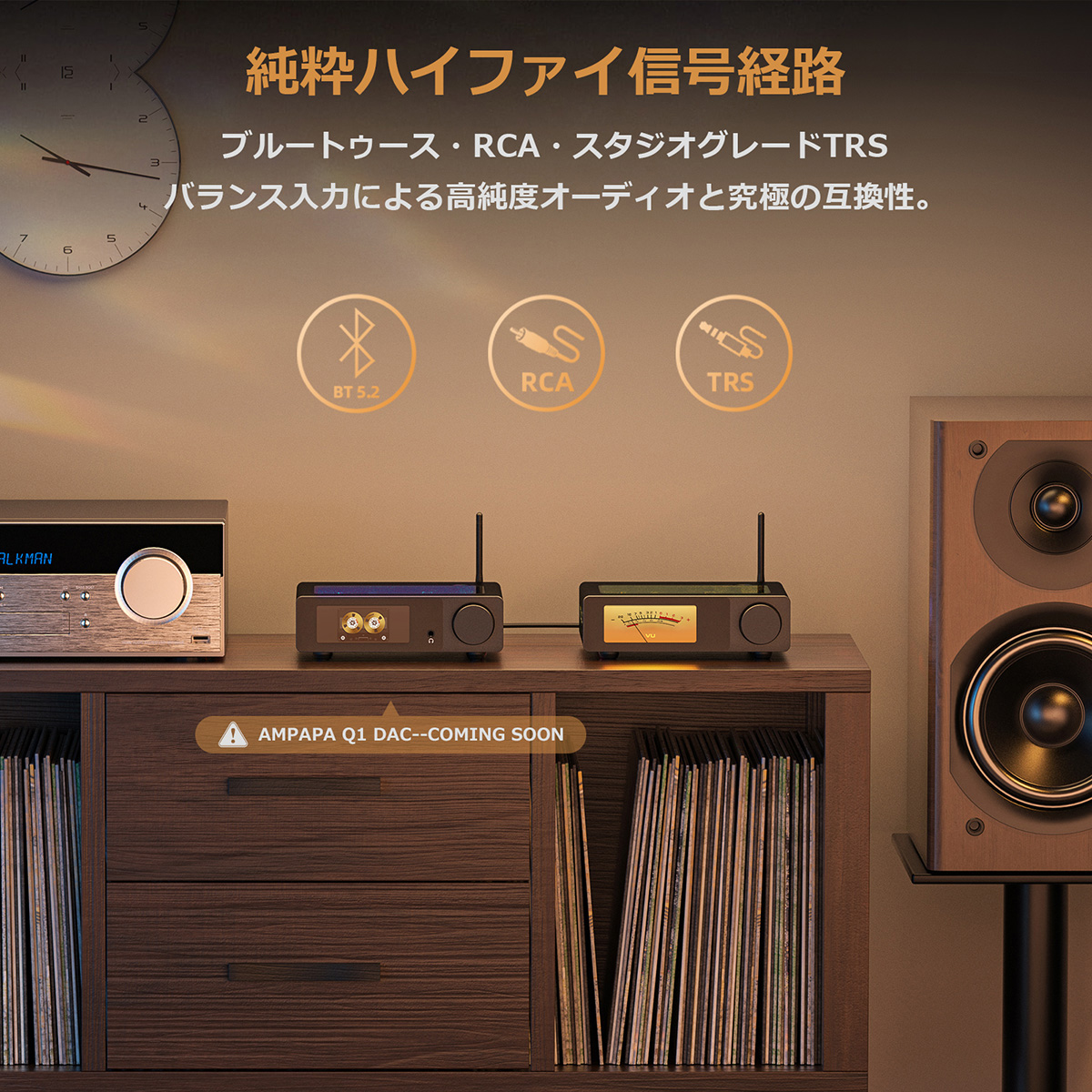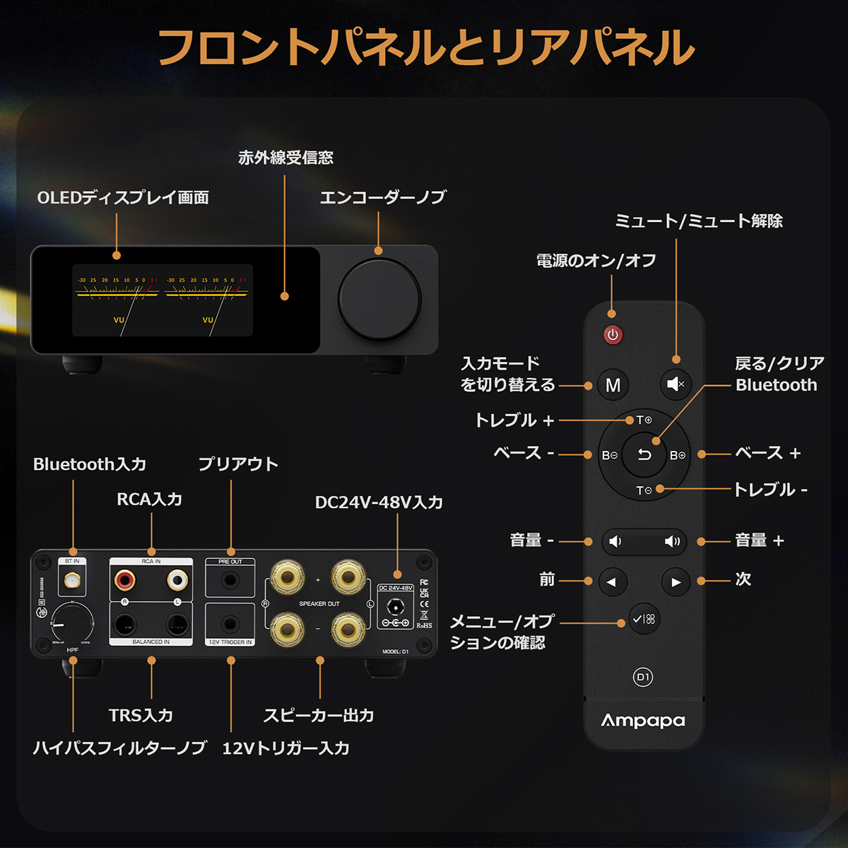Ampapa × Douk Audio コラボレーション: 高評価を得たDouk Audio A5アンプを基に構築されたD1は、TPA3255チップ、HPF、PRE-OUT、ソケット式オペアンプといった中核機能を継承―さらにデジタルVUディスプレイ、TRSバランス入力、Bluetooth 5.2、トレブル/バスコントロール、リモコンなどをアップグレードし、次世代のHiFiパフォーマンスを実現。