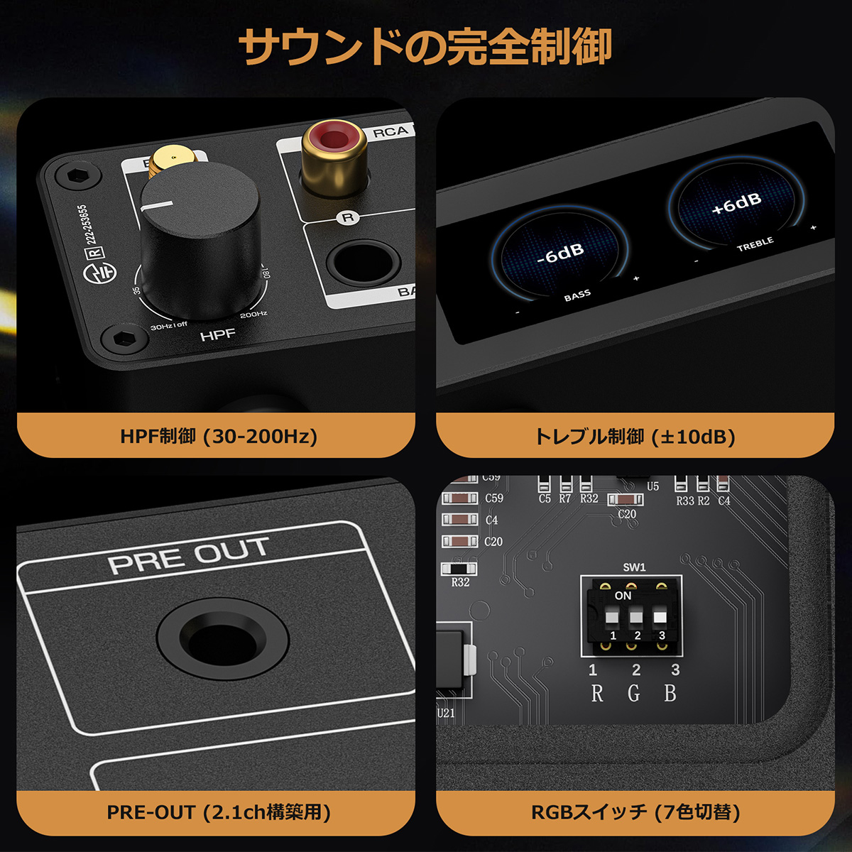 真の2.1システムのために設計: 調整可能な30?200Hzハイパスフィルターは、メイン出力から低周波数を除去し、ステレオスピーカーにより優れた明瞭度で中域と高域に集中させることを可能にします。同時にPRE-OUTは、アクティブサブウーファー、アンプ、またはアクティブスピーカーへフルレンジ信号を提供します。