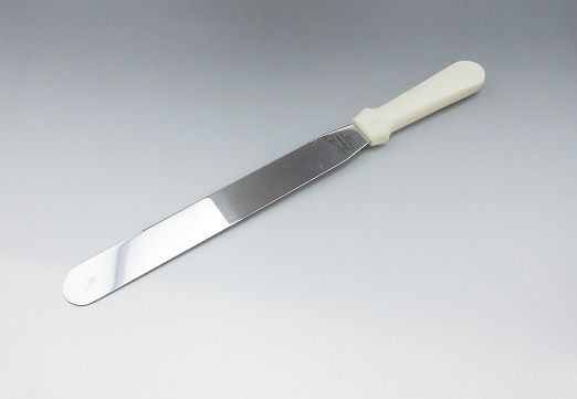 クリームを塗る他、チョコレートを薄く塗り広げる、型に流し込んだ生地の表面をならす、型の縁で擦り切りする、薄いクッキーやクレープ生地を天板から剥がすなどの作業に使用します。