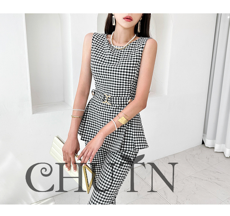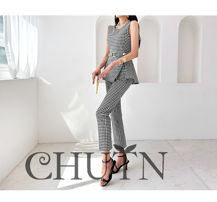 パンツスーツ夏レディースパンツセットノースリーブジャケット+パンツ チェック柄テーラードジャケット 九分丈パンツ 通勤秋スーツビジネス オフィス フォーマル