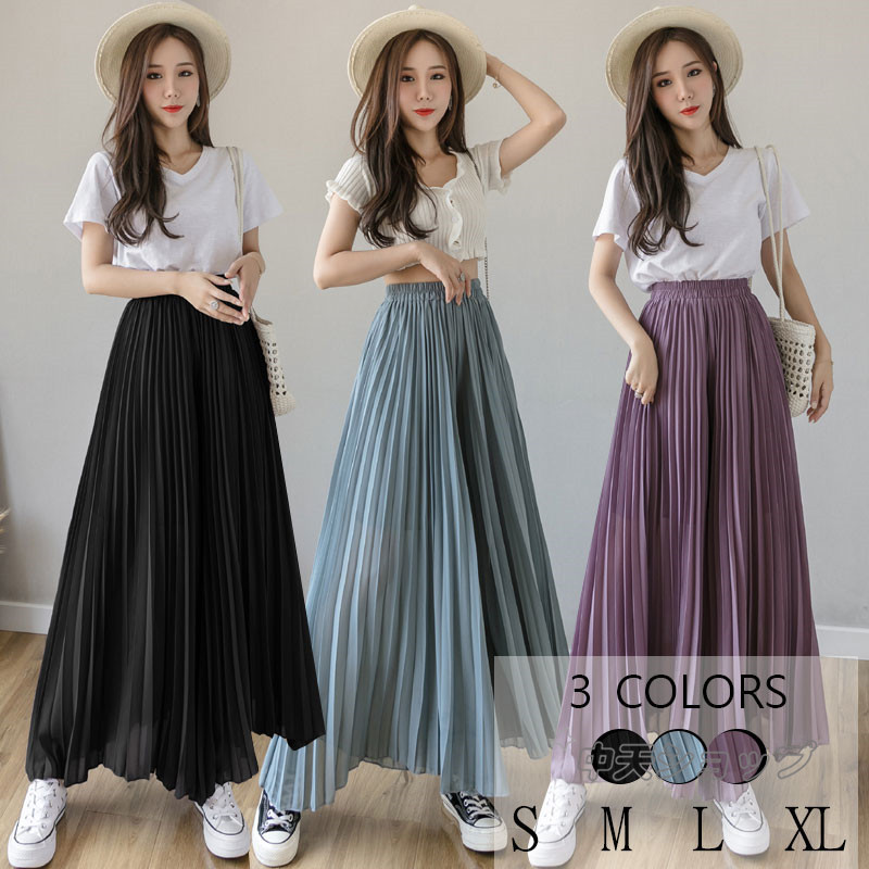 ◆キュロットスカート ワイドパンツ ロングパンツ サマー 薄手 カジュアル シフォンパンツ プリーツ ハイウエスト ウエストゴム デート 通勤 通学 快適 きれいめ