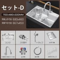 セット D:シンク本体、水切りラック、ゴミ受付、水切り籠、伸びる蛇口(吐水モード三種)、止水栓、給水管