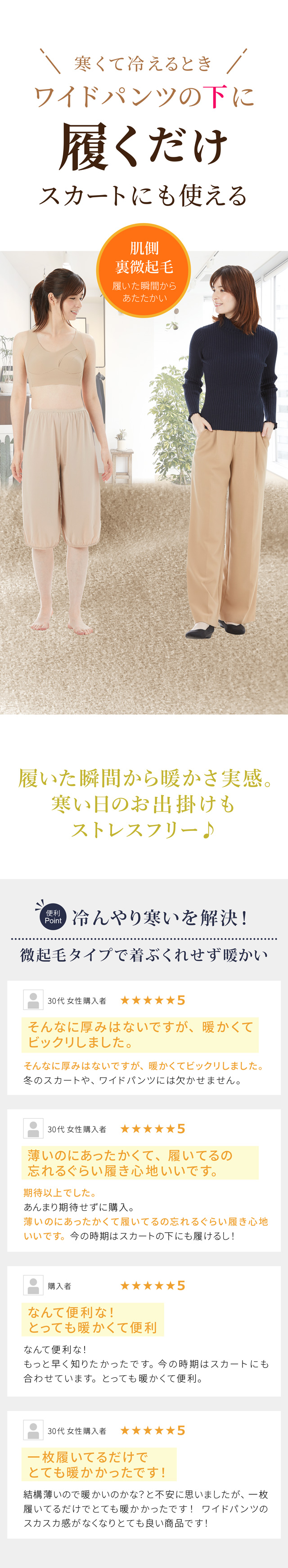 ・ボトムの中に穿くだけで足元が冷える季節も暖かく快適。