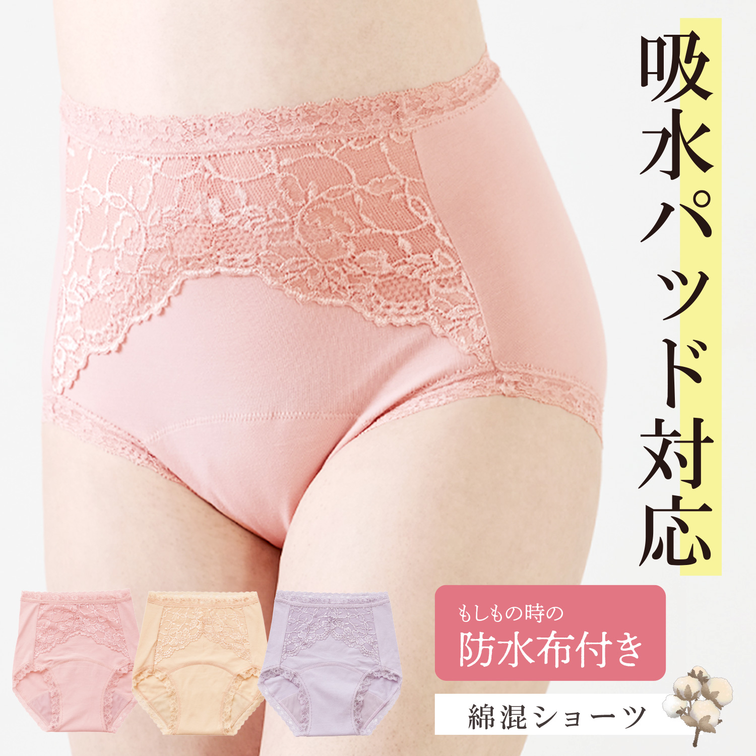 市販の吸水パッドを付けてはく、レース付き「吸水パッド対応」綿混ショーツです。