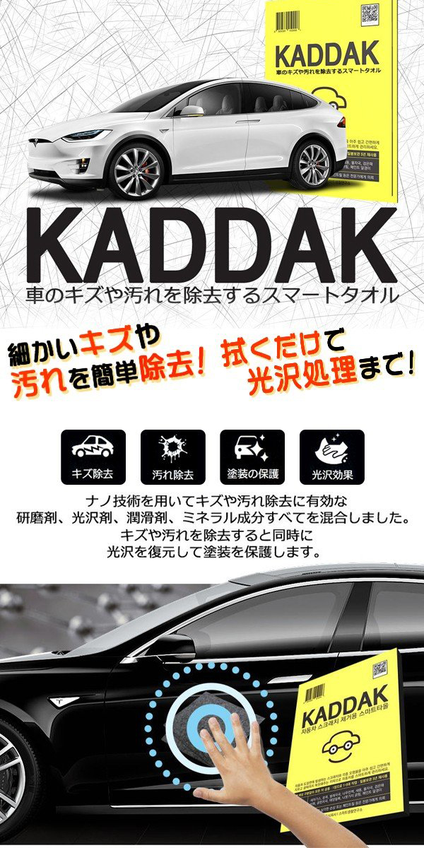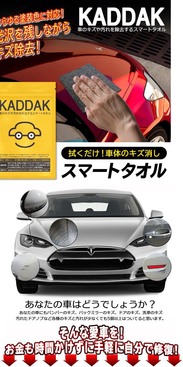 | ◆ | 使い方はかんたん! 車体についたホコリなどをよく乾いたタオルであらかじめきれいに拭きとります。 あとは、KADDAKスマートタオルでキズや汚れのある部分をゴシゴシ磨き上げるだけ! 磨いた後、磨いた部分に残った液体を拭き取れば完了! 道具や洗剤を用意する必要はありません。 水で流す手間も無く、ちょっと気になったらパパっとお手入れできるのでラクラク♪ |