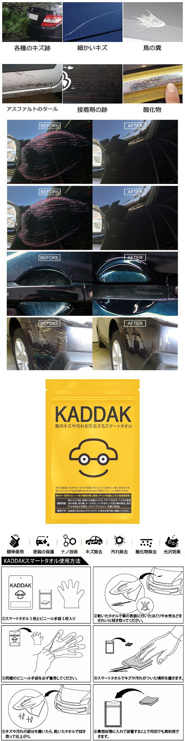 | ◆ | KADDAK スマートタオルにできること ● 車体のキズや汚れの除去 ● 光沢剤+ミネラルオイルを含有した特殊液体でキズの除去&光沢効果 ● 酸化物やアスファルトのタールなどしつこい汚れも簡単除去 ● ナノ技術とミネラルオイルが塗装面を長期間保護 ● 車2台分の成分含有 ● 何度でも繰り返し使用可能 ※ 使用後は必ず専用フリーザー袋に入れて保管してください。 |