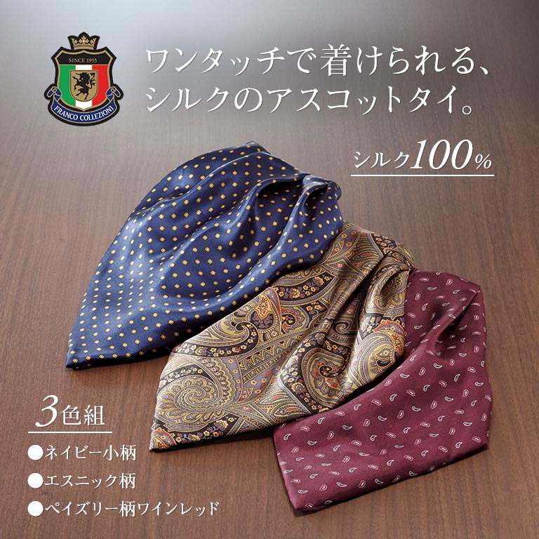 ワンタッチアスコットタイ 3色組 アスコットタイ メンズ レディース 簡単 ワンタッチ スカーフ ネクスカーフ シルク 首元 おしゃれ フォーマル ネックウェア