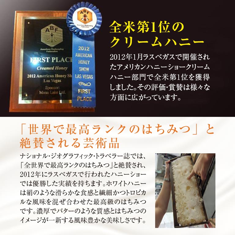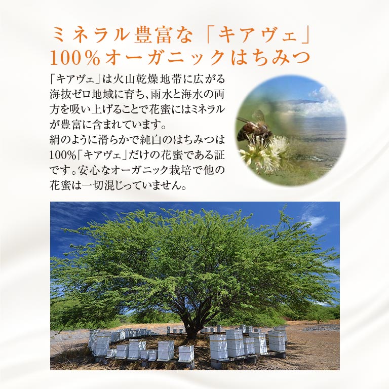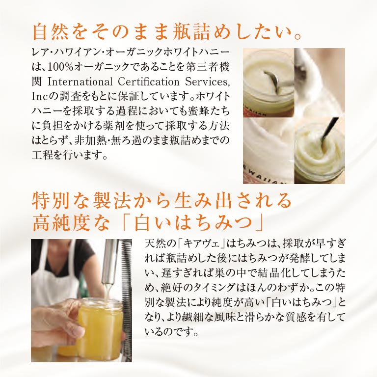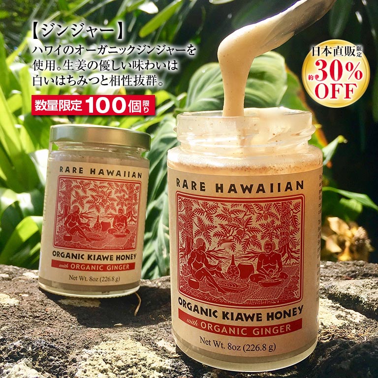 100%オーガニックな『幻の白いはちみつ』ナショナル・ジオグラフィック・トラベラー誌で「全世界で最高ランクのはちみつ」と絶賛された『白いはちみつ』。ハワイ島の火山乾燥地帯に広がる海抜ゼロ地域に生息するKIAWE(キアヴェ)という木の花蜜だけを集め作られています。非加熱で瓶詰めされたRAW HONEY(生はちみつ)は、天然の成分はそのままに、酵素が生き続ける高純度なはちみつです。バターのように濃厚で、自然な甘さと深みが口いっぱいに広がります。重要な栄養価や有益な小さな花粉、プロポリス、ミツロウのかけらを蜂蜜の中に残す、手間暇かけた製法で作られており大量生産はできません。健康を気にされている方やスイーツ好きの方には喜ばれる贈り物になるはずです。プレーンとジンジャーの2種類の味をご用意しました。世界で一番美味しいといわれている、日本初上陸の100%オーガニックな『白いはちみつ』を是非ご賞味ください。