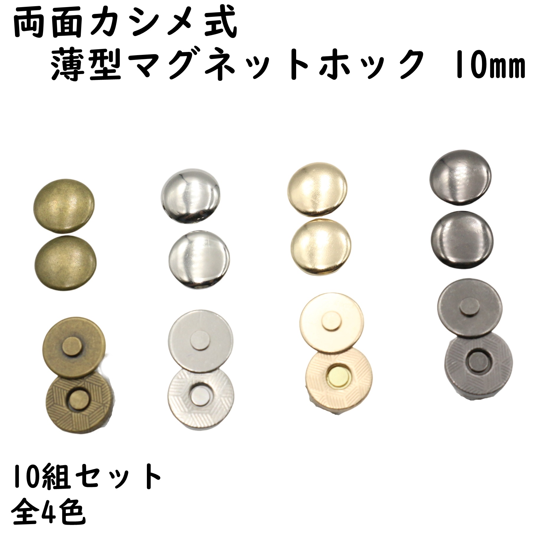 両面カシメ式 薄型マグネットホック 10mm 10組セット 全4色