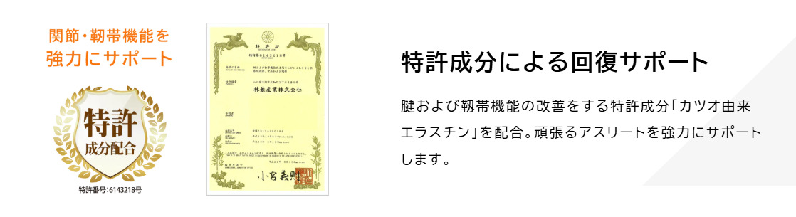 ■強度な運動サポート:腱および靱帯機能の改善をする特許成分のカツオ由来エラスチンペプチド配合。頑張るアスリートを強力にサポートします。