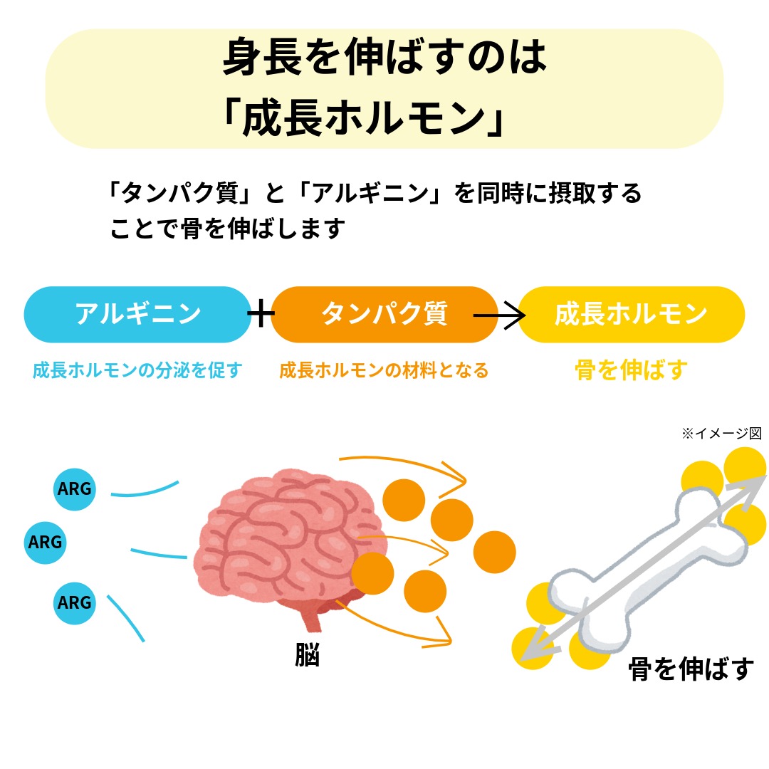 ■成長期サポート:タンパク質とアルギニンを高配合。同時に摂取することで骨を伸ばします。