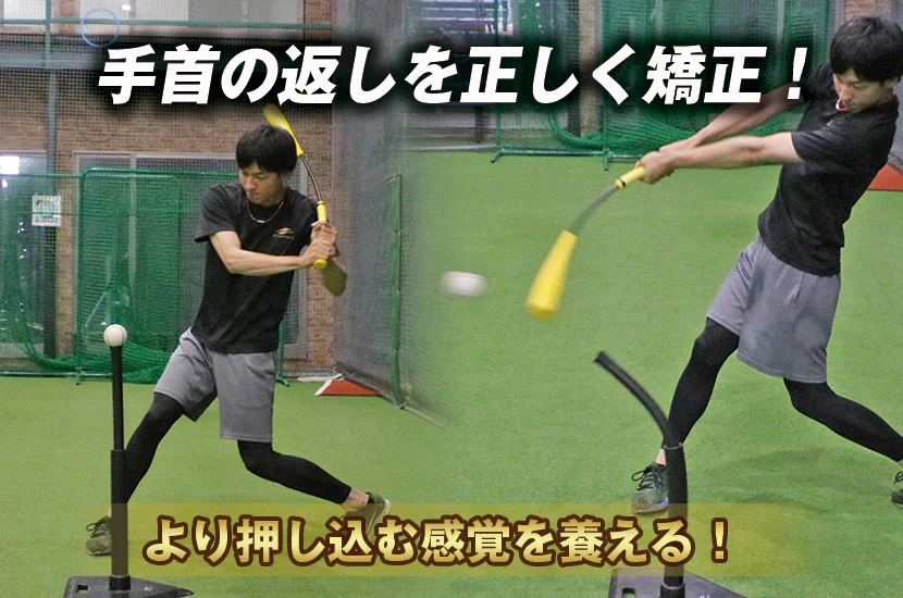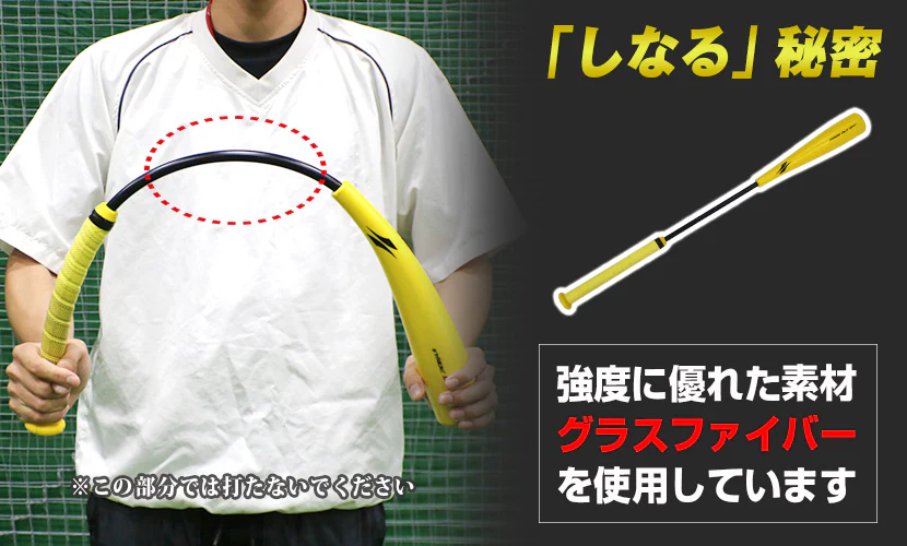 バットにしなりが生まれることでバットが遠回りするドアスウィングを改善。自然とインサイドアウトのスウィングに近づいていきます。ヘッドの遠心力を利用することで手首の返し、ボールの押し込みが自然と身に付き、打球の飛距離が伸びます。
