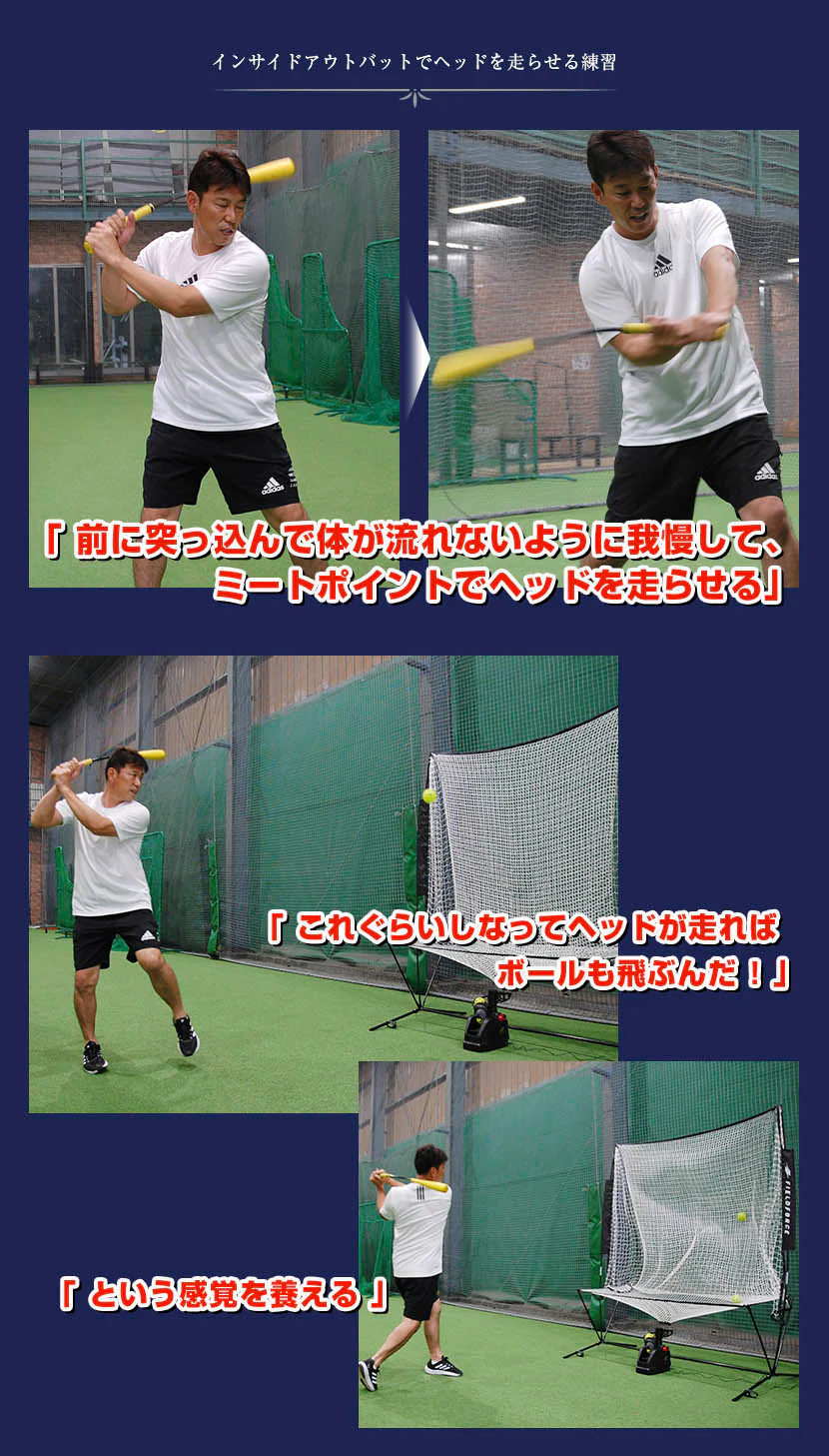 バットにしなりが生まれることでバットが遠回りするドアスウィングを改善。自然とインサイドアウトのスウィングに近づいていきます。インサイドアウトのスウィングをすることで無駄のないスウィングとなりミート力が上がります。
