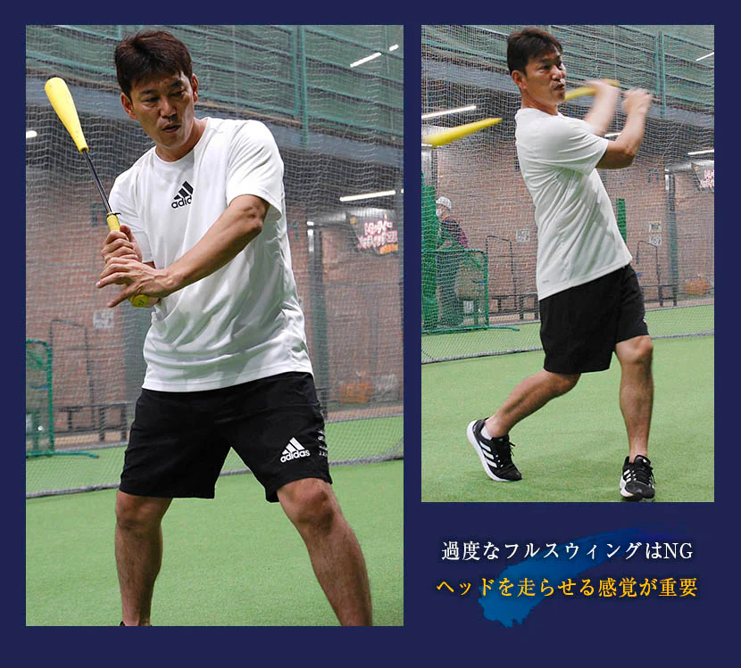 ヘッドの遠心力を利用することで手首の返し、ボールの押し込みが自然と身に付き、打球の飛距離が伸びます。