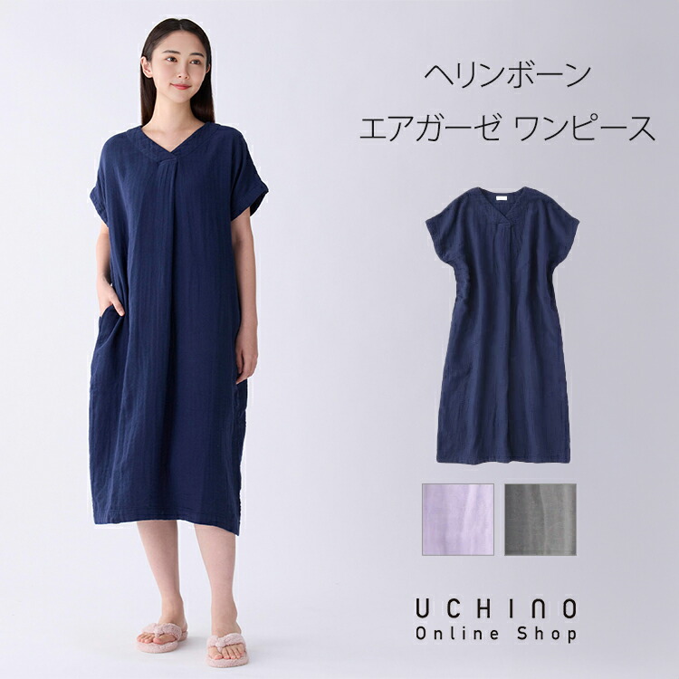 【Web限定商品】ルームウェア レディース UCHINO ヘリンボーンエアガーゼ Vネック ワンピース 半袖 綿100% 部屋着 ゆったり ウチノタオル 母の日