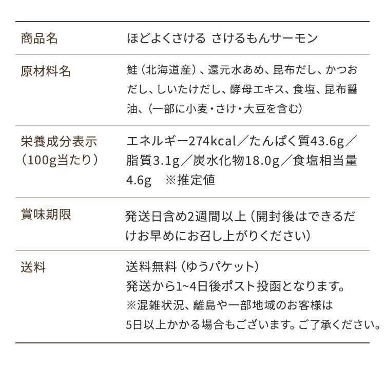 【原材料】鮭(北海道産)、還元水あめ、昆布だし、かつおだし、しいたけだし、酵母エキス、食塩、昆布醤油、(一部に小麦・さけ・大豆を含む)