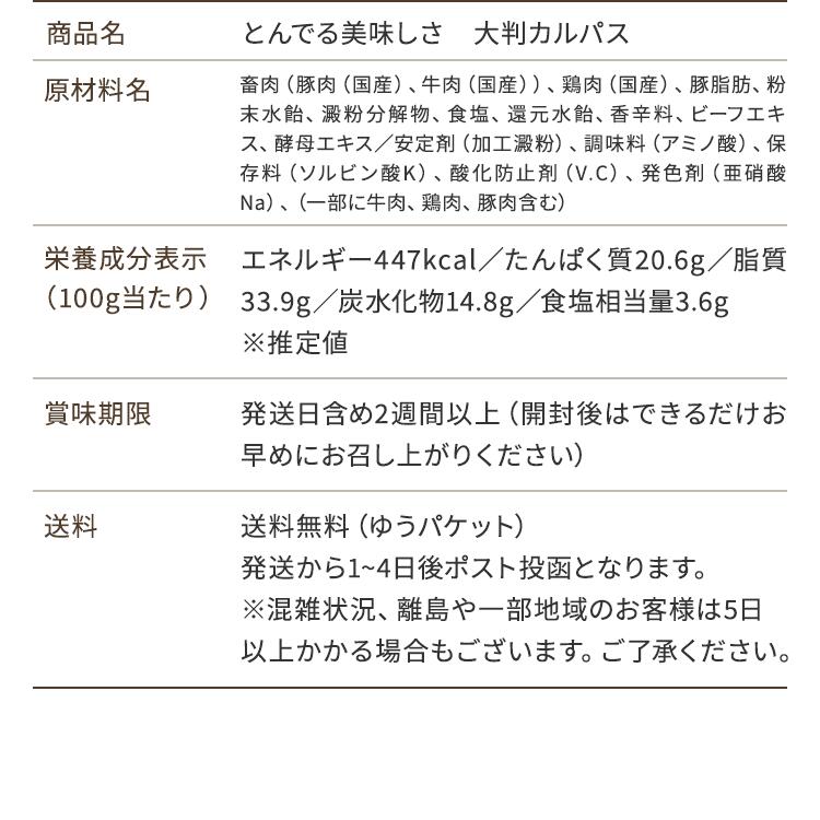 【原材料】畜産(豚肉(国産)、牛肉(国産))、鶏肉(国産)、豚脂肪、粉末水飴、澱粉分解物、食塩、還元水飴、香辛料、ビーフエキス、酵母エキス/安定剤(加工澱粉)、調味料(アミノ酸)、保存料(ソルビン酸K)、酸化防止剤(V.C)、発色剤(亜硝酸Na)、(一部に牛肉・鶏肉・豚肉を含む)