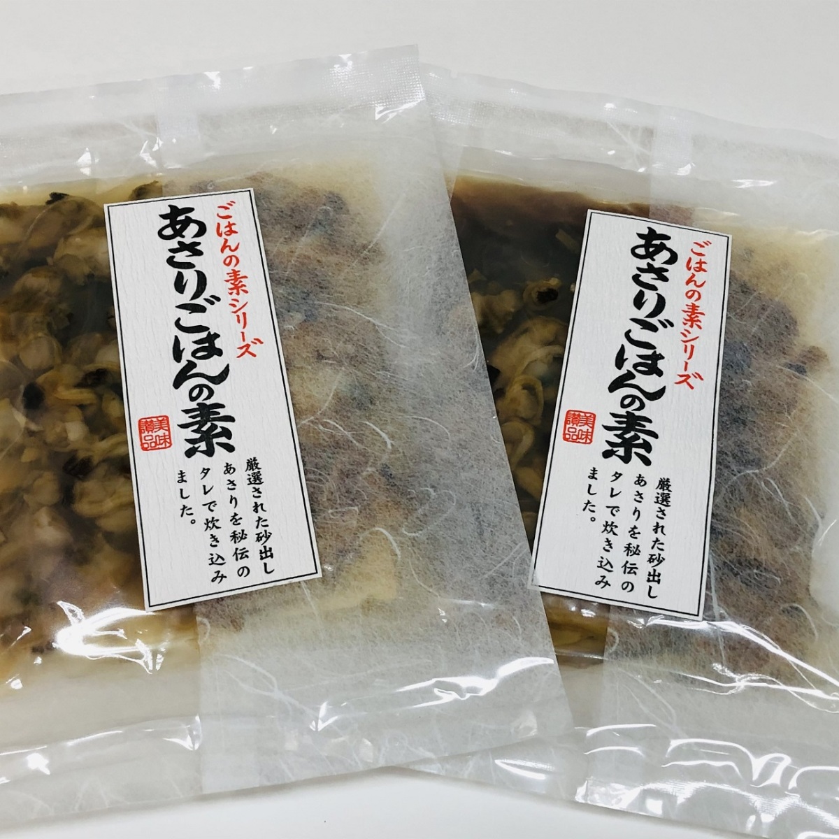 原材料名 具材【あさり(中国産)、醸造調味料、還元水飴、塩、砂糖、清酒、風味原料(かつお)、昆布エキス/調味料(アミノ酸等)】、調味液【醤油、醸造調味料、ブドウ糖、砂糖、清酒、鰹節エキス、昆布エキス】(一部に小麦・大豆を含む)