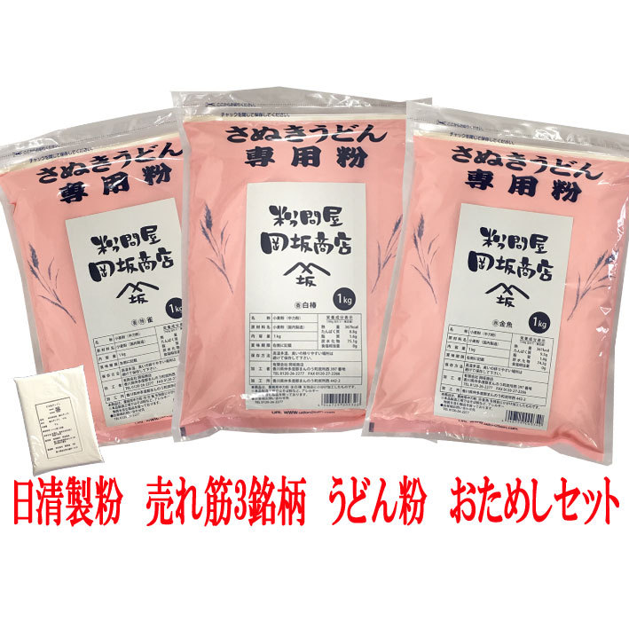 小麦粉卸問屋を営む当店が厳選した、讃岐うどん用小麦粉(中力粉)の売れ筋銘柄の3点セットです。