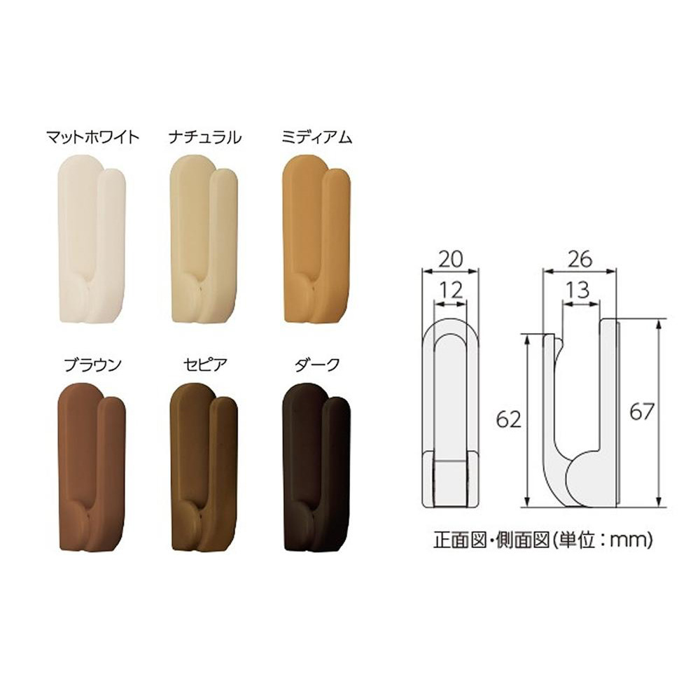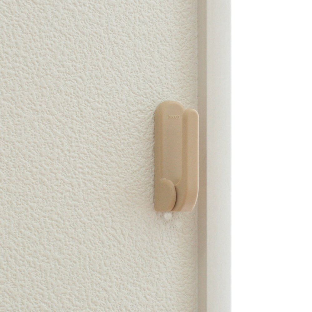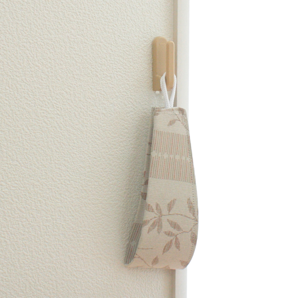 商品…カーテンを束ねる為のタッセルをかける「房かけ」です。フック部に負荷がかかることによりフックが降りる仕組みになっているため引っ掛け事故を防止します。