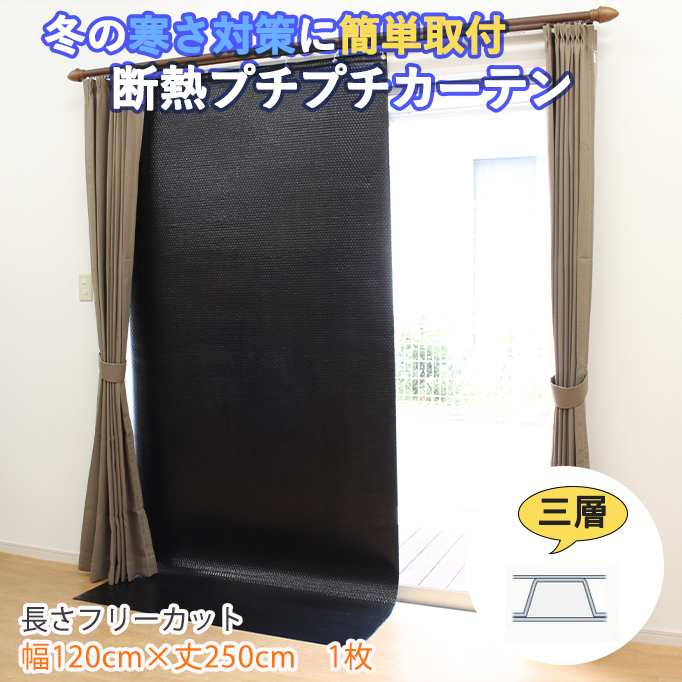 防寒 断熱 プチプチカーテン 三層 ブラック 1枚 取付けフック付き 幅120cm×丈250cm ハトメ仕様 フリーカット 黒