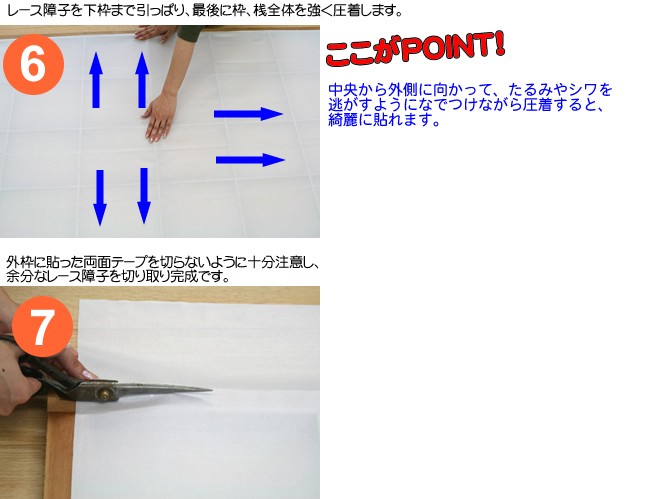 3.レース障子を下枠まで引っぱり、最後に枠、桟全体を強く圧着します。
