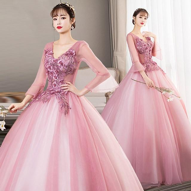 フレア袖 ウェディングドレス 長袖 Vネック ロングドレス 贅沢 花嫁 プリンセスライン パーティードレス 結婚式 演奏会 結婚式