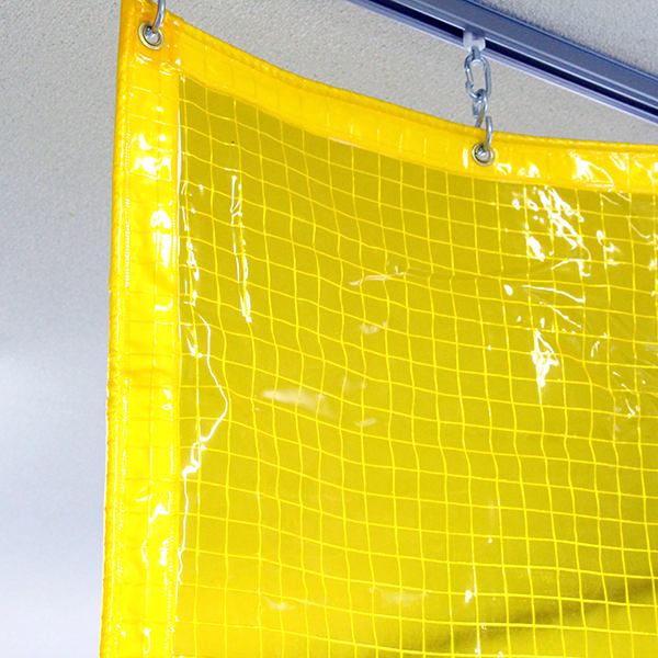 防炎物品ラベル(防炎ラベル)をビニールカーテンに貼付。