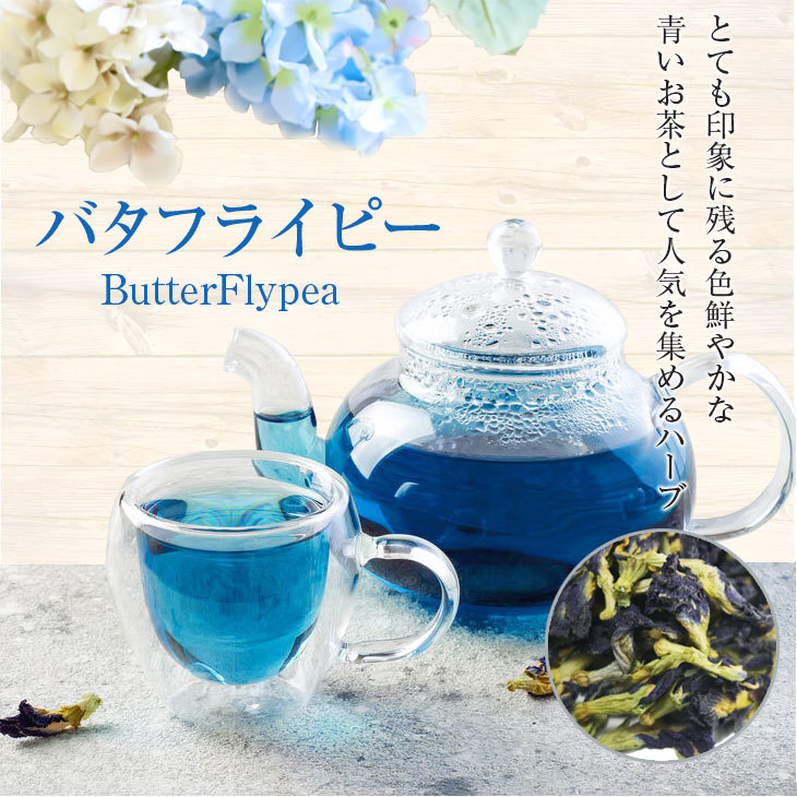 バタフライピー別名:『アンチャン』『藍胡蝶』『チョウマメ』部位:花とても印象に残る色鮮やかな青いお茶として人気を集めるハーブのバタフライピー、その色合いの正体は花に含まれる天然色素によるもの東南アジアが原産のマメ科の植物で、羽を広げた蝶に似た花を咲かせることから英語圏ではバタフライピー、日本語ではチョウマメと呼ばれています。原産地であるタイではお茶として飲まれるだけなく、ゼリーやクリームなどお菓子の色付けに使われたり、服飾や染め物に利用されるなど生活の中で活用されているハーブ。花は染料に、葉は飼料に、未熟豆は食用にと幅広く利用され人々の生活を支えています。気になるバタフライピーのハーブティーとしてのお味は鮮やかな見目とは裏腹にマメの風味を感じる素朴な味わい。飲みやすく日常的に続けられる味で、味の主張が激しくないので他のハーブとのブレンドに向くほか、カクテルやお菓子作りなどにぴったりです。バタフライピーのハーブティーにレモンやライムなどを加えると青色から赤紫色に色合いが変化し、一層目を楽しませてくれます。色鮮やかなバタフライピーのハーブティーをぜひ一度楽しんでみてください。【いれ方】お湯を沸かします。沸騰直後の95度以上が適温です。カップ1杯(150ml)のお湯に対しティースプーン1杯程度を用意し利用します。1分-2分程度抽出させてお召し上がり下さい。量、時間等はお好みで調整して下さい。)