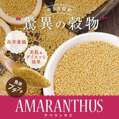 アマランサスアマランサスはヒユ科ヒユ属の一年草で紀元前六世紀頃から南米で栽培されていたとされています。アステカ人の主食として食べられており、儀式の食事や蚤のにも加工されるため、当時は宗教的にも欠かせない食べ物だったといわれています。耐寒性はありませんが、pHや塩分、環境の変化に強く、旱魃にも強い丈夫な植物で環境適応能力に優れています。植物としては2mほどの大きさになり、アマランス・レッドと呼ばれる特徴的な鮮やかな色合いの花を咲かせます。このため、日本には江戸時代に鑑賞用の植物として伝来し、その後東北地方などで食用栽培も行われました。ご飯と混ぜて炊き込みご飯として食べても美味しいですが、ポテトサラダ一人前に下ごしらえの済んだアマランサス大匙一杯を加えるとぷちぷちとした食感を楽しめます。また、ポップコーンのように調理し、砂糖や蜂蜜を混ぜたものがメキシコでお菓子として親しまれています。アマランサスご飯炊き方1.白米はボールに入れて水で洗い、ざるにあけて水気を切ります。2.アマランサスをボールに入れ、水を加えて軽く混ぜて浮いてくるごみを捨て、目の細かいざるにあけて水気を切ります。3.1と2を炊飯器に入れ、2.5合強の目盛りの水を加えます。4炊けたら蒸し、しゃもじで上下を返すようにさっくり混ぜます。少々アマランサスの香りが強くでることがありますので、3の時に塩を小さじ一杯弱加えると香りが薄まります材料白米 2.5合雑穀 0.5合(塩を加える場合)塩 小さじ1弱