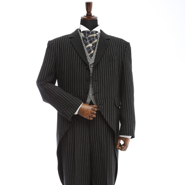 【特 徴】 | 黒にストライプが鮮やかなモーニングコートのタキシード。タータンチェックのネクタイやギンガムチェックのベストで可愛らしさをイメージしつつ、ダークトーンでまとめることで男性が着こなしやすいタキシードです。