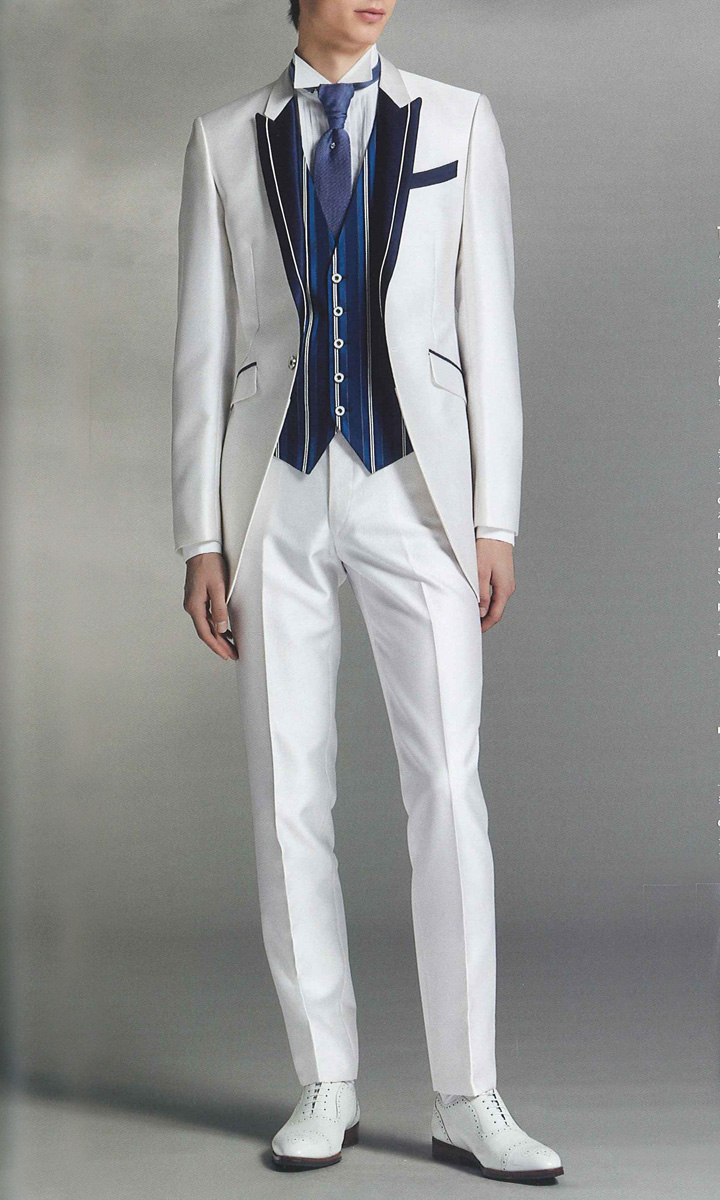 | 【商 品 名】 | レンタル タキシード | | 【品 番】 | TX-M-20377 | | 【商品内容】 | ジャケット / ベスト / パンツ / ネクタイ / サスペンダー | | 【特 徴】 | 結婚式にふさわしい純白の華やかな光沢素材に、ネイビーブルーをアクセントに添えたフレッシュなチュニックタキシード。 エレガンスに魅せる着丈があらゆる挙式スタイルに対応可能な一着。 スリムで小さいサイズからトールサイズ、キング体型まで幅広くサイズをご用意しています。