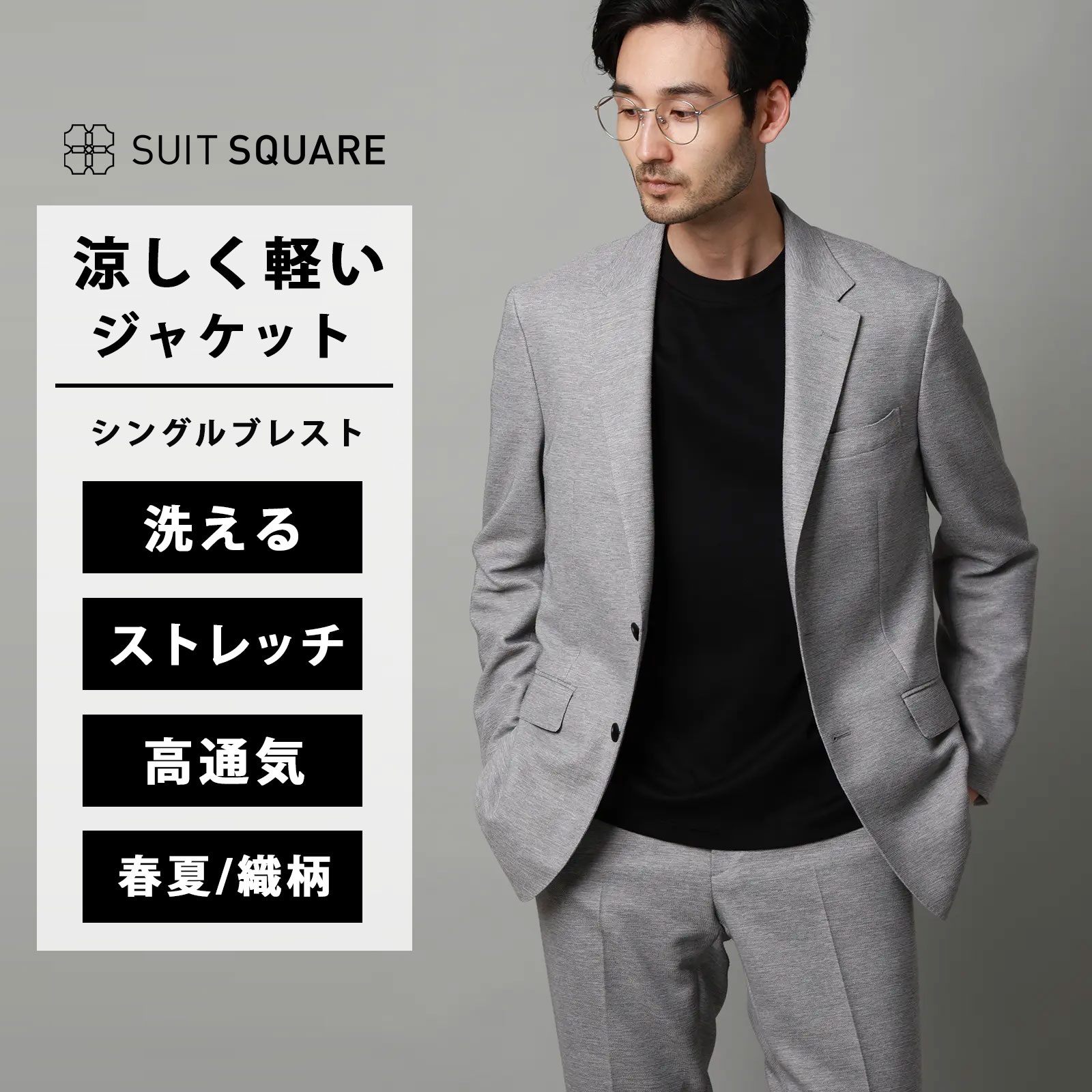 【スーツスクエア】涼しい ジャケット メンズ 春夏 グレー 灰色 織柄 2つボタン 背抜き サイドベンツ 洗える ウォッシャブル ストレッチ 動きやすい 高通気