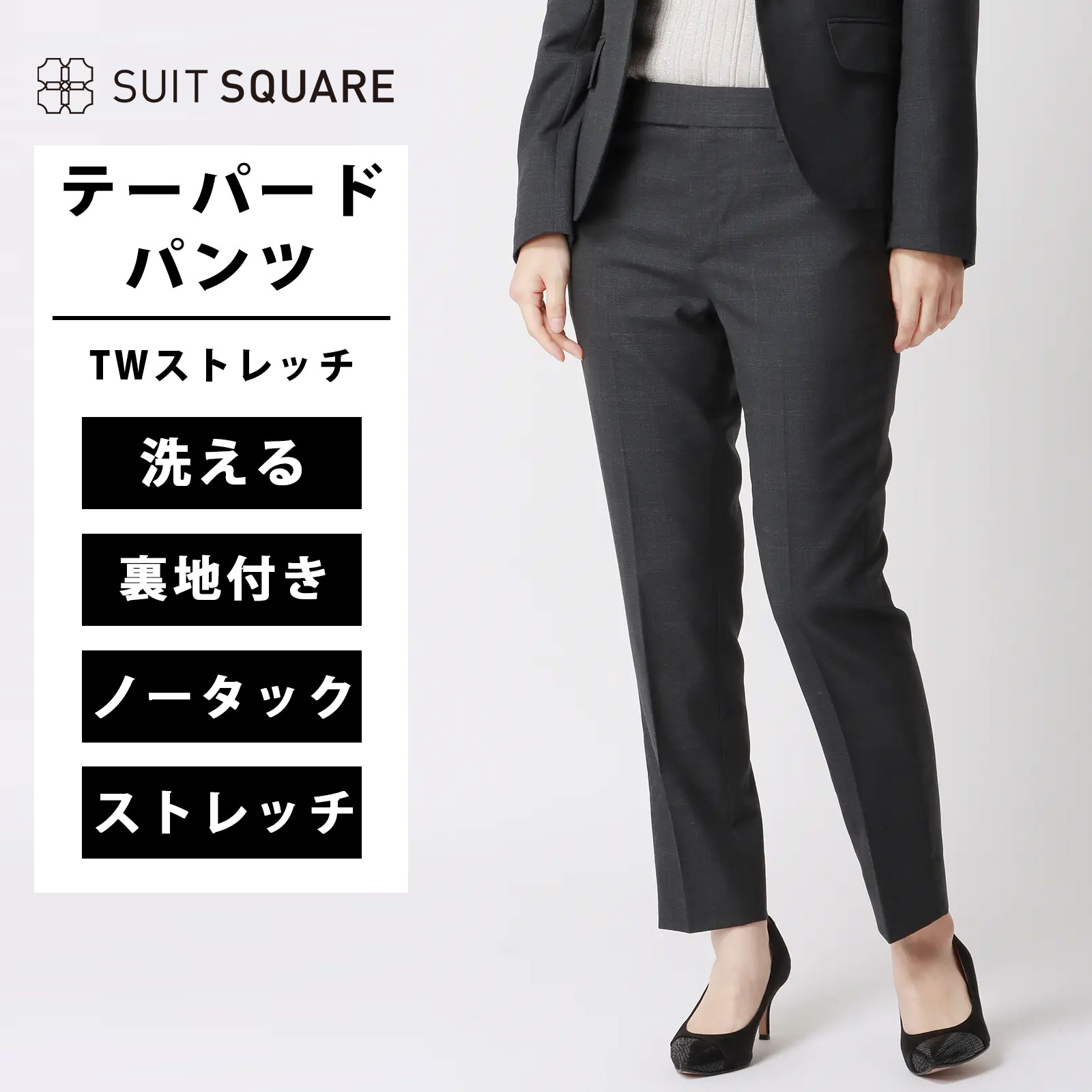 【スーツスクエア】レディース テーパードパンツ テーパード パンツ ウォッシャブル TWストレッチ グレンチェック ノータック 裏地 9分丈 スラックス グレー系