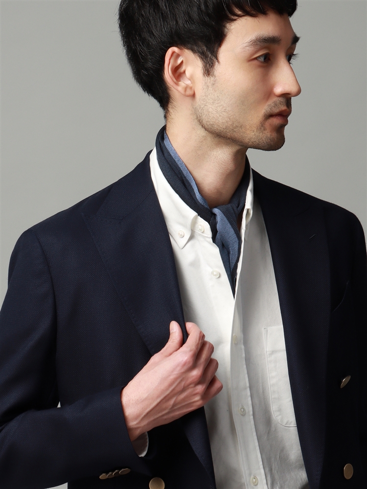 縦に長く、先端を斜めにカットしたデザインのスカーフ。ジャケットから覗かせたり、首元にくるっと巻いたりと様々なアレンジを楽しめます。