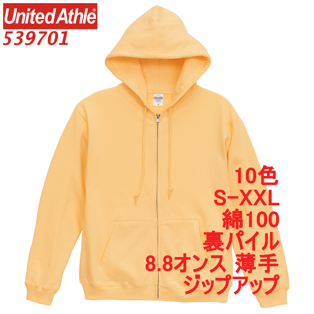 539701 パーカー 薄手 8.8オンス 裏パイル ジップアップ フルジップ 無地 定番 シンプル ベーシック スウェット 5397-01 5397 ユナイテッドアスレ UnitedAthle