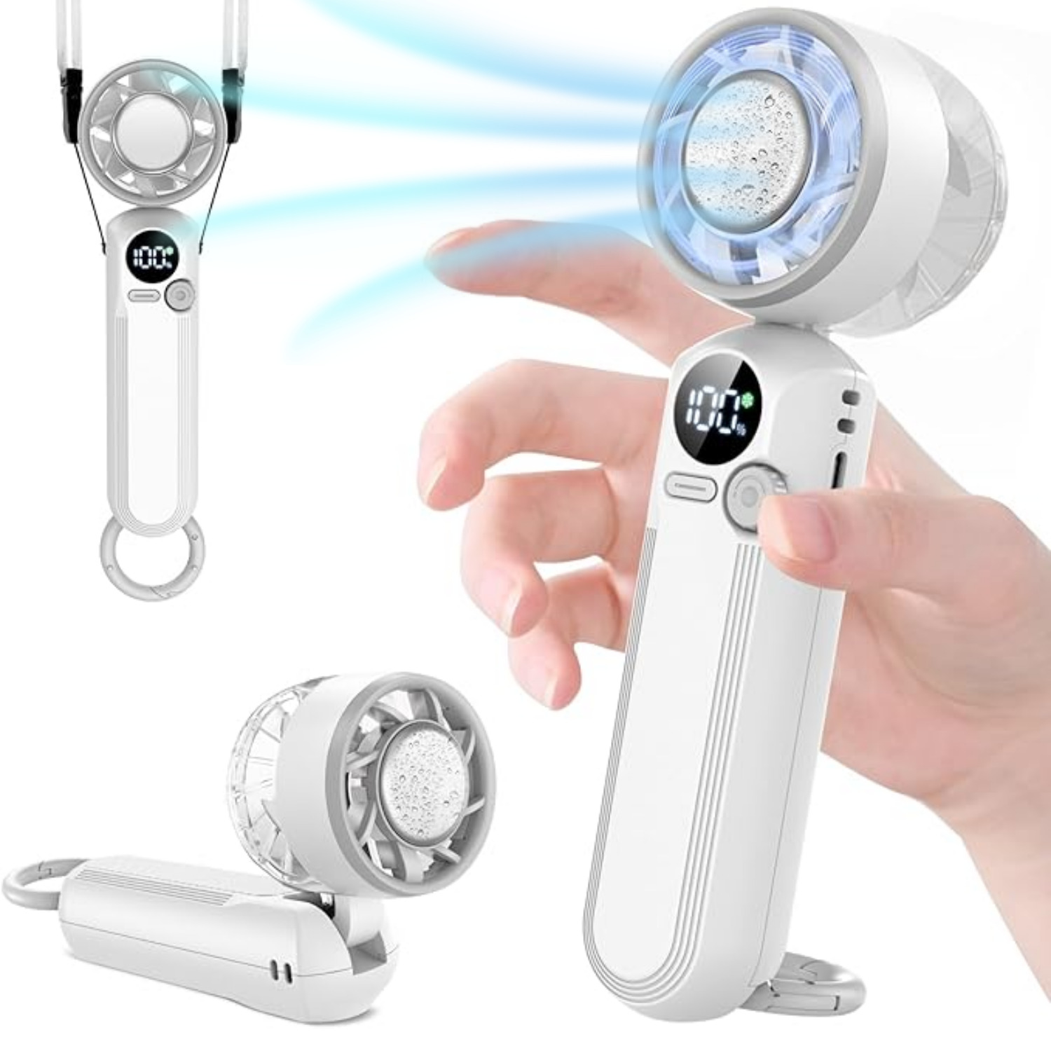 ハンディファン 1秒冷感 100段階パワフル風量 首掛け/卓上/手持ち/腰掛け カラビナとストラップ付き 最長12h稼働 超軽量160g 静音20dB 2h急速充電 熱中症対策