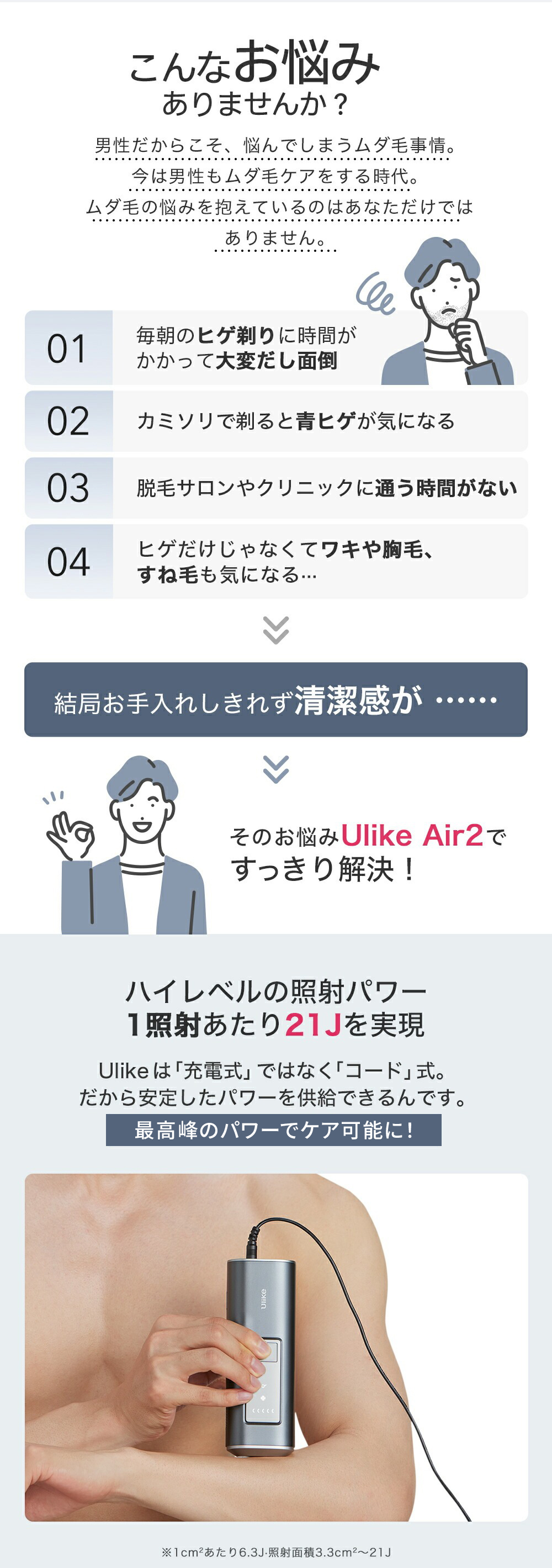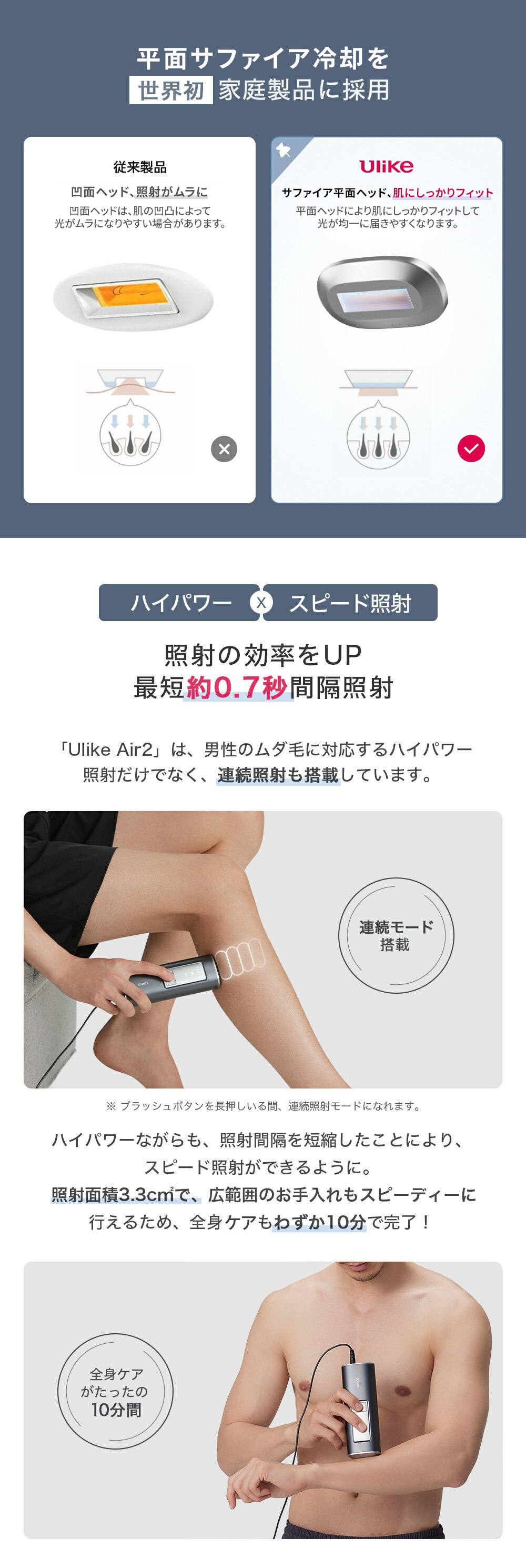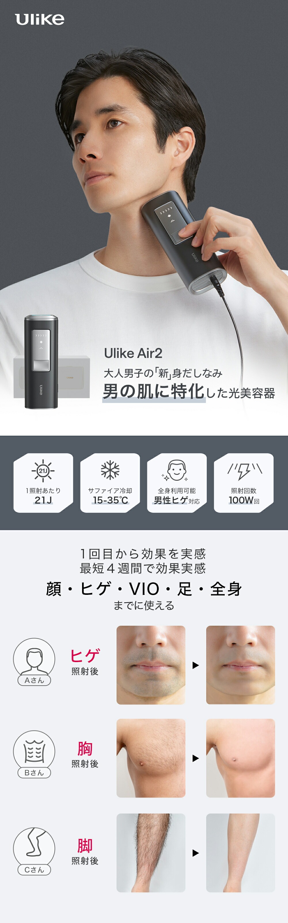 Ulike Air2は、太くて硬く濃いムダ毛に特化した、男性のために開発された家庭用光美容器です。ハイパワー&スピード照射で効率アップ、効率よくムダ毛ケアが行えます。頑固なムダ毛をスッキリ除毛、剛毛でも効果。パワフルさが特徴で、ヒゲや胸毛などもケアできます。